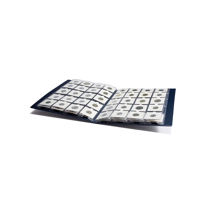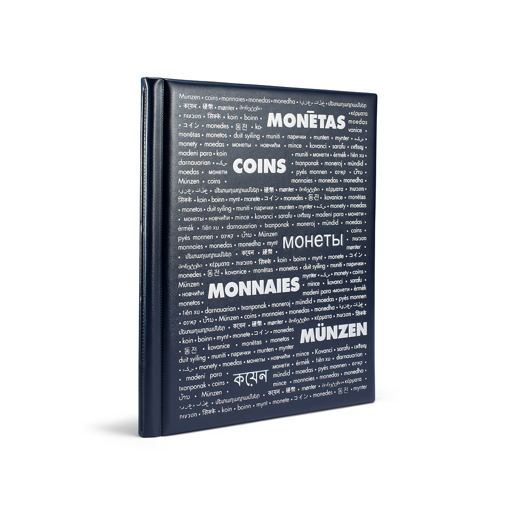 Album azul oscuro para guardar 200 cartones de monedas. Con 10 resistentes fundas firmemente encuadernadas para 20 cartones cada una. Tapas acolchadas con impresión en la tapa de color plata.