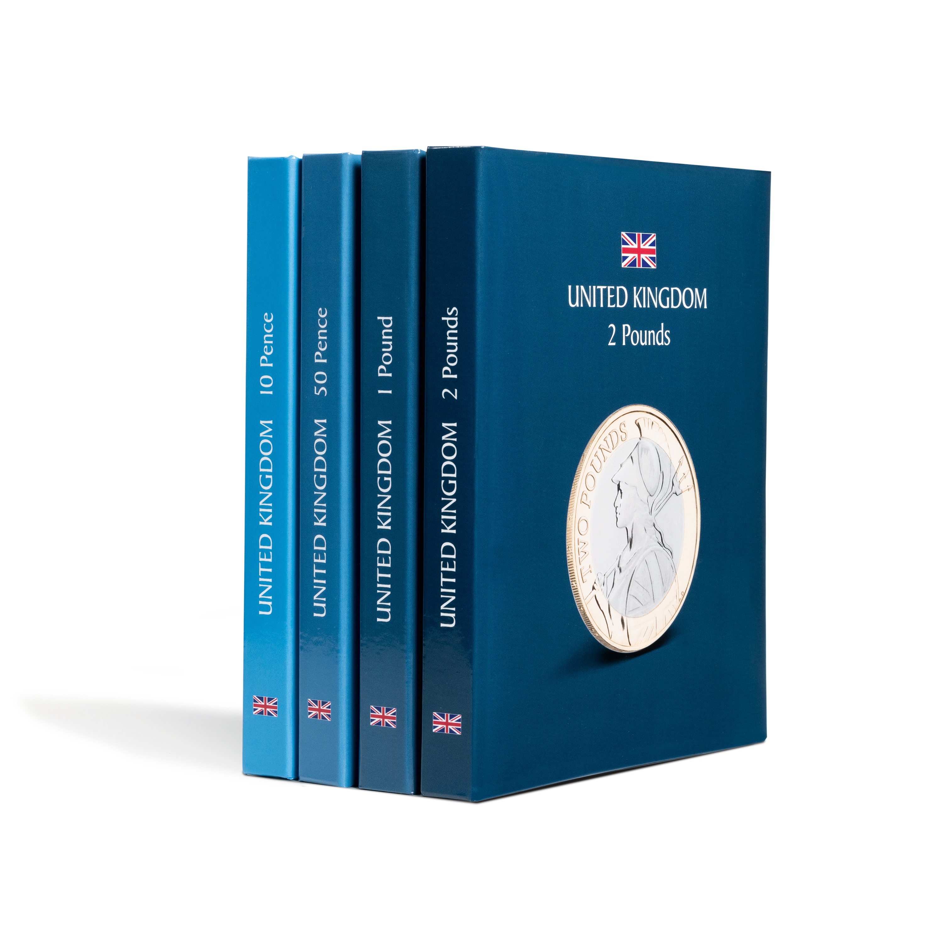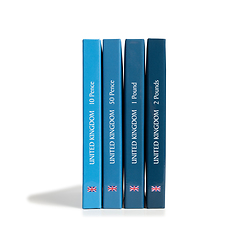 Estos álbumes con un moderno diseño tienen las tapas laminadas y, cada uno, 4 fundas firmemente encuadernadas (6 fundas en la versión «50 pence») de PVC duro (100% sin plastificantes) para las monedas correspondientes. ¡Empieza ahora una colección real!