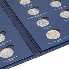 El álbum Presso se ha convertido en un accesorio imprescindible para los coleccionistas de monedas de dos euros y, ahora, este álbum de primera calidad también está disponible para monedas de 50 peniques de Gran Bretaña. Su atractivo diseño y su elaboración de alta calidad con un resistente cartón son muy populares entre los coleccionistas, al igual que su sencillo manejo: las monedas se colocan en las perforaciones con el tamaño exacto de forma fácil y cómoda. El álbum tiene capacidad para un total de 48 monedas. Junto a las perforaciones figuran algunos datos como el tema de la moneda y el volumen de emisión. De esta forma, los coleccionistas pueden ver a simple vista qué rarezas les faltan en su colección de «50 p».