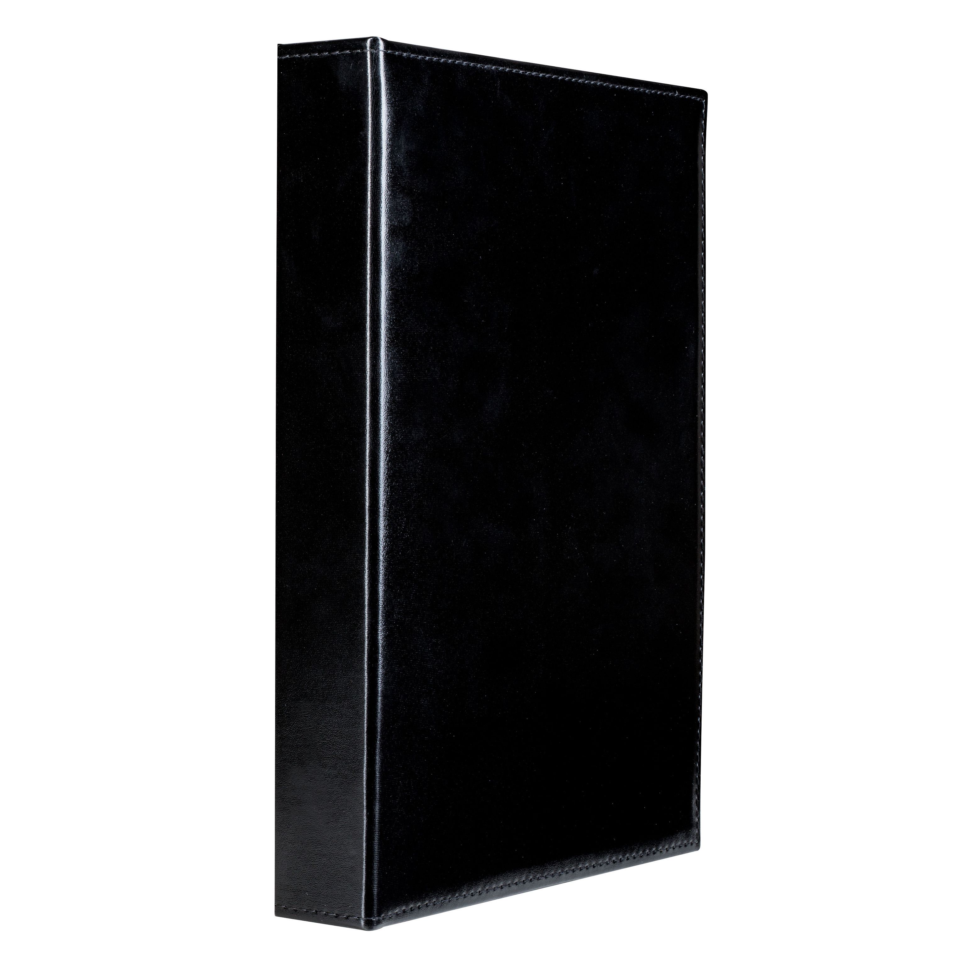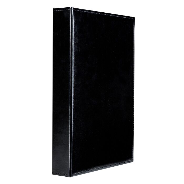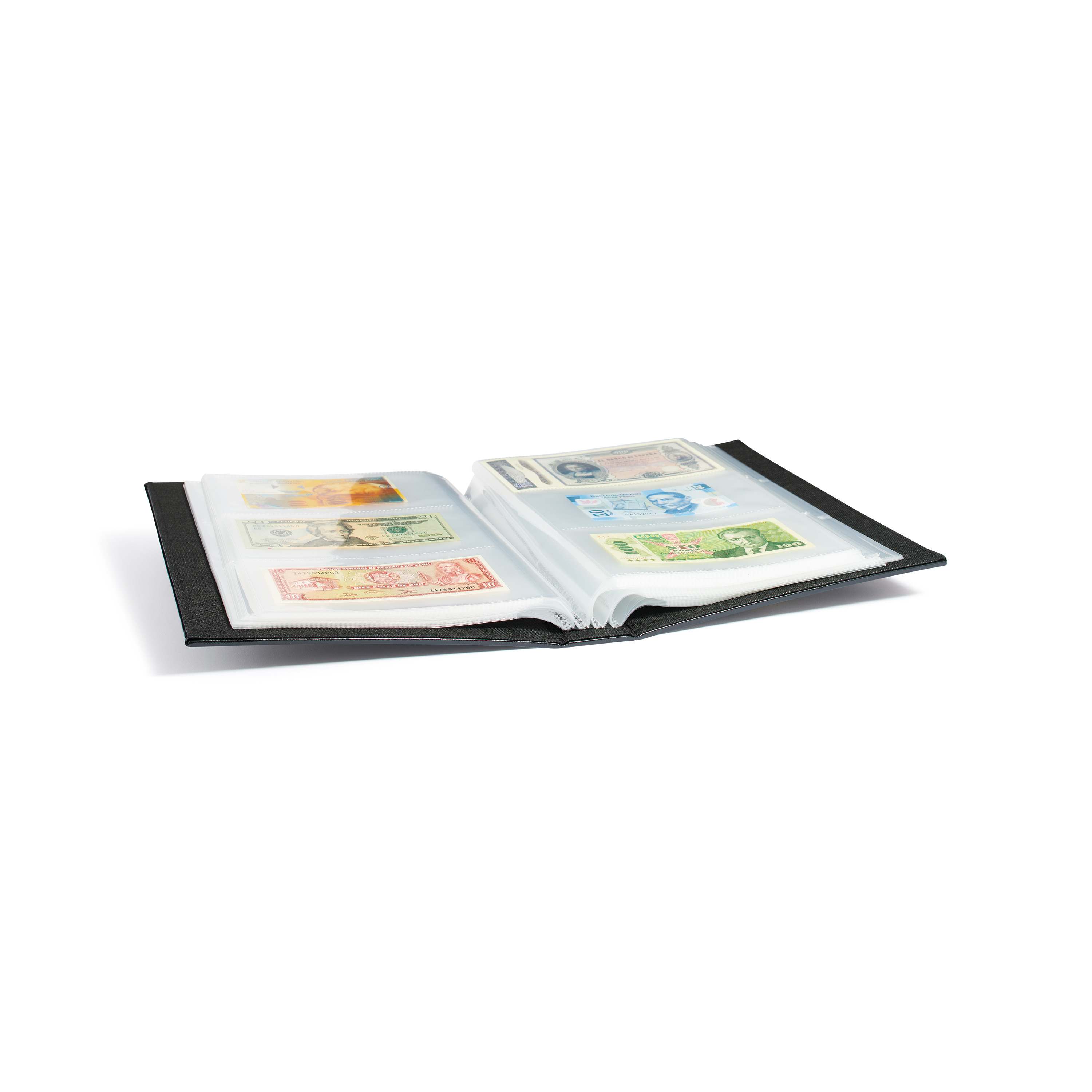 Elegante álbum con un clásico diseño con 100 fundas transparentes y firmemente encuadernadas para 300 billetes de banco. Protección especial de los billetes gracias a las fundas 100 % sin plastificantes. Álbum con una fabricación de primera calidad con bordes cosidos y tapas en imitación a cuero de color negro. Tamaño interior de las fundas: 184 x 97 mm. Tamaño exterior del álbum: 245 x 330 x 50 mm.