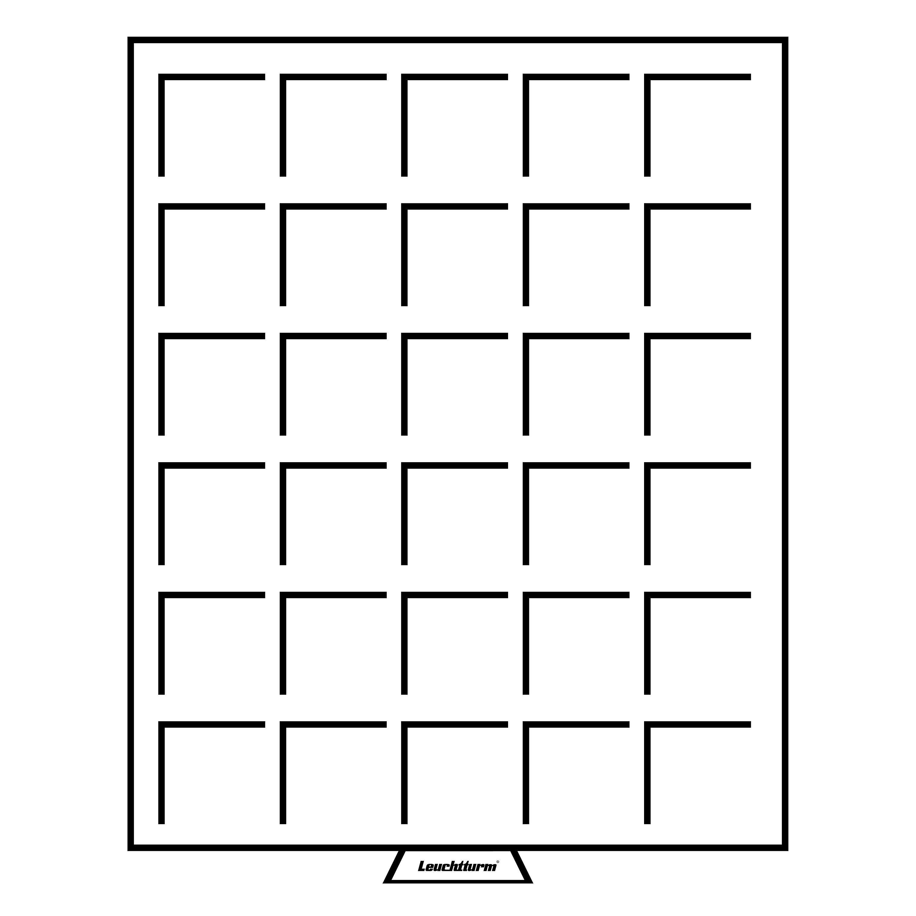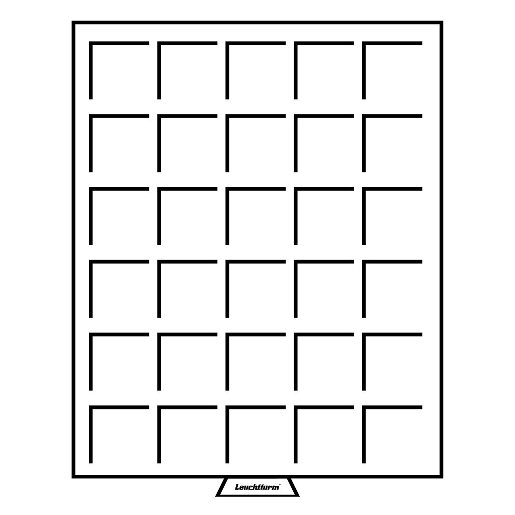 Bandeja en caja color humo, con superficie aterciopelada en rojo oscuro. Con 30 divisiones esquinadas. Compartimentos adecuados para 30 monedas en cápsulas hasta de un diámetro de 38 mm. Las bandejas se pueden completar, colocándolas una encima de la otra.