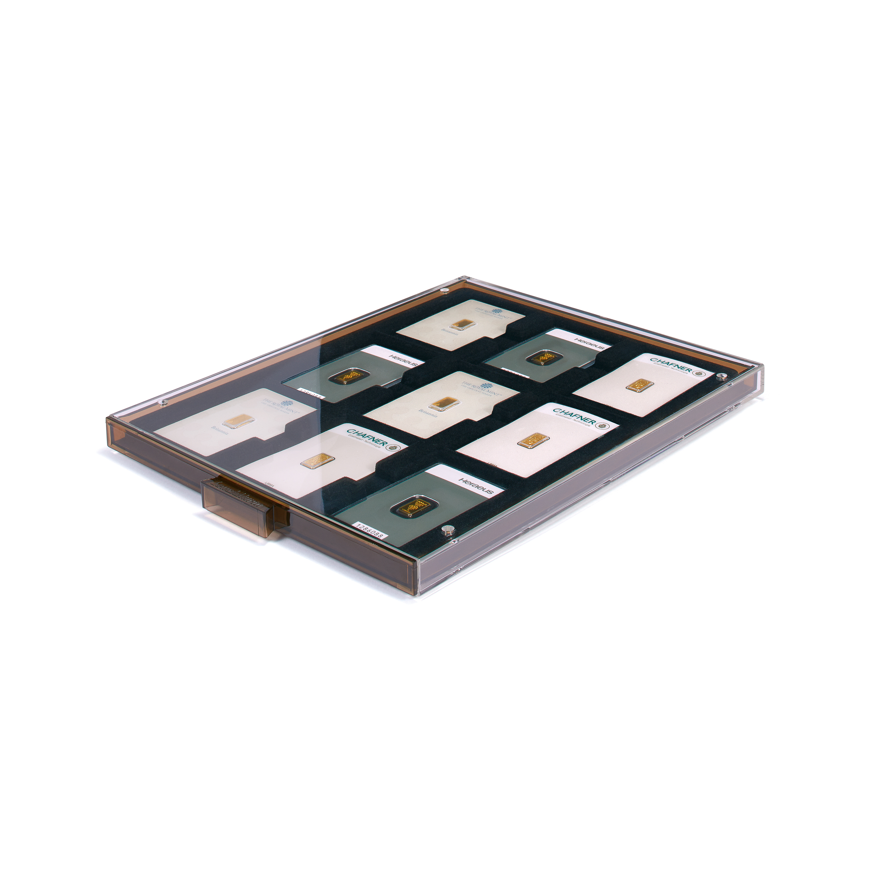 La caja de monedas tiene espacio para 9 lingotes de oro en blíster.