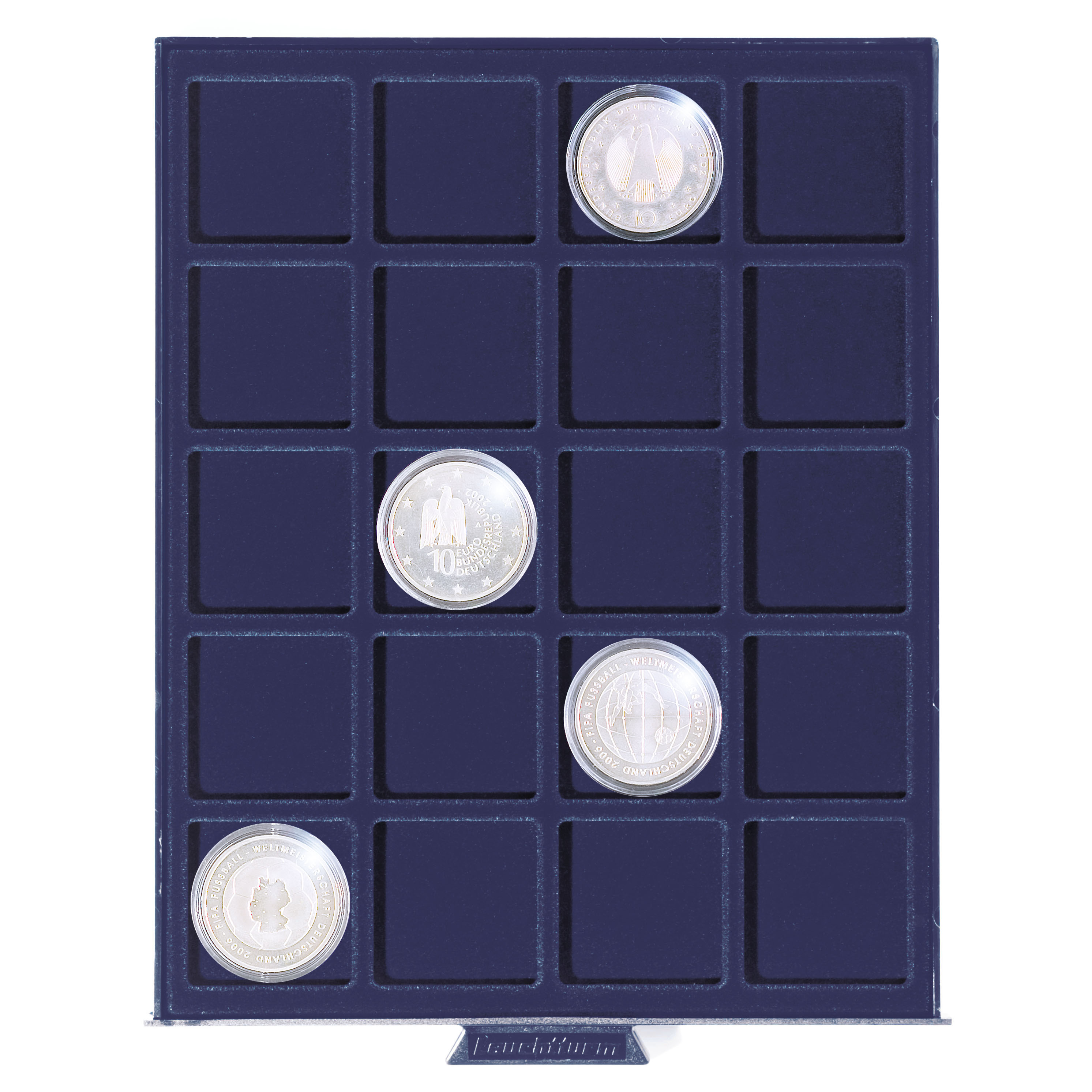 Bandeja con interior forrado en terciopelo azul y con caja exterior transparente. Con 20 divisiones esquinadas, la bandeja está apta para monedas hasta un diámetro de 41 mm. Formato exterior: 19 x 195 x 250 mm.