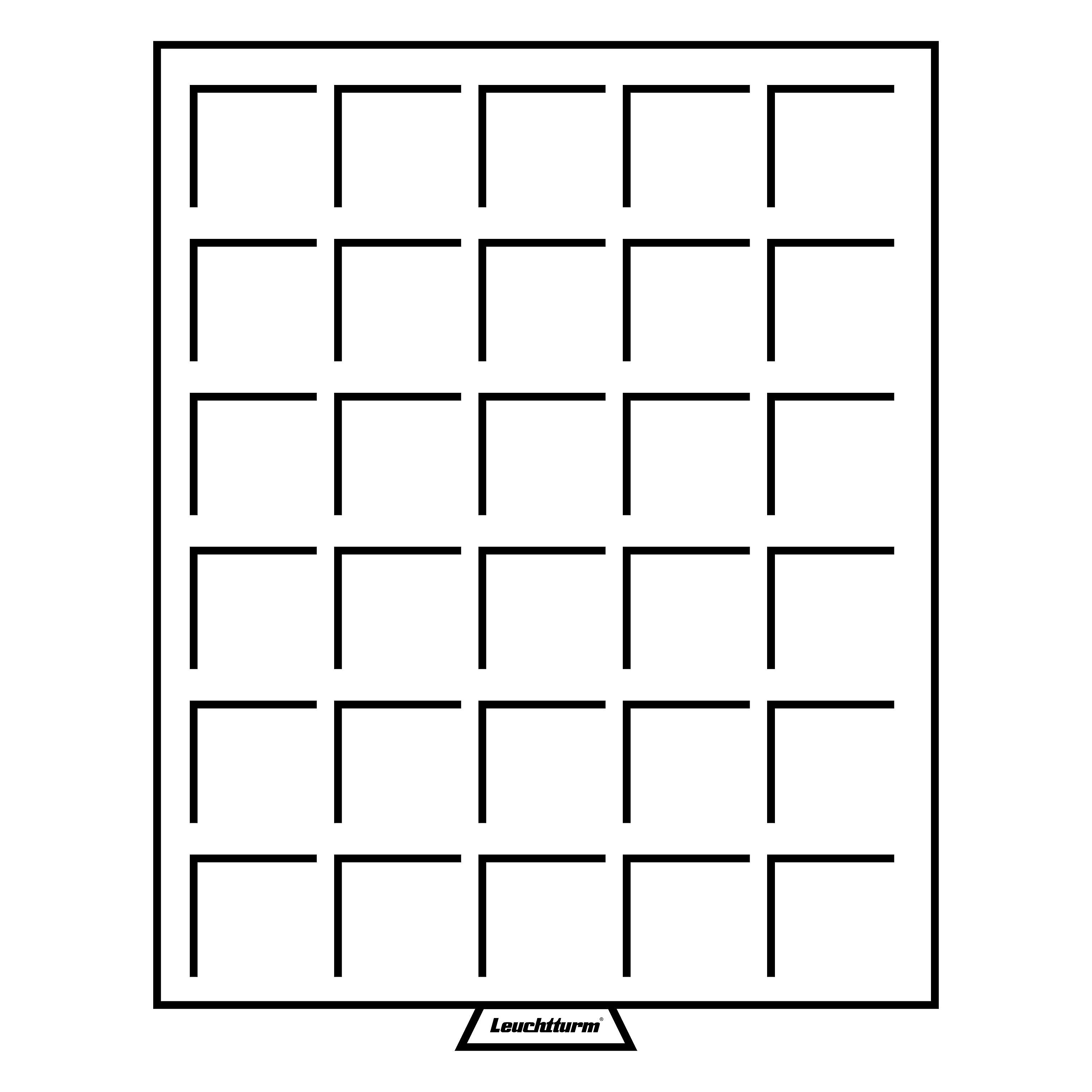 Bandeja con interior forrado en terciopelo azul y con caja exterior transparente. Con 30 divisiones esquinadas, la bandeja está apta para monedas hasta un diámetro de 33 mm (p. ej. monedas de 10 euro, 10 DM, 2 euro en cápsulas). Formato exterior: 19 x 195 x 250 mm.
