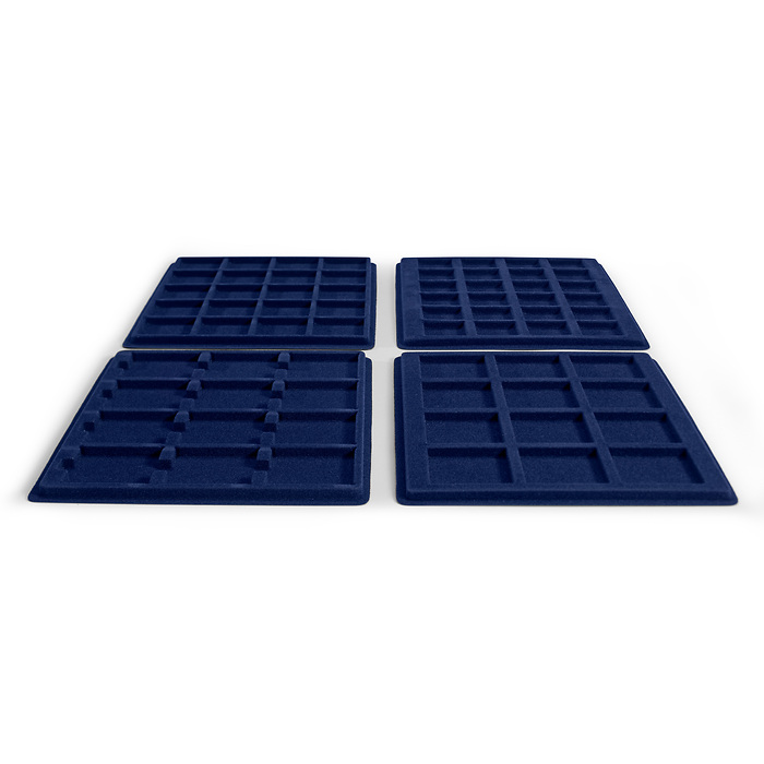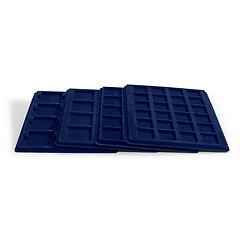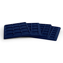 Bandejas con superficie en imitación a terciopelo azul para guardar sus monedas. Las divisiones esquinadas facilitan una cómoda colocación de las monedas con o sin cápsulas. Compatibles con el maletín CARGO S. Formato: 237 x 192 mm.