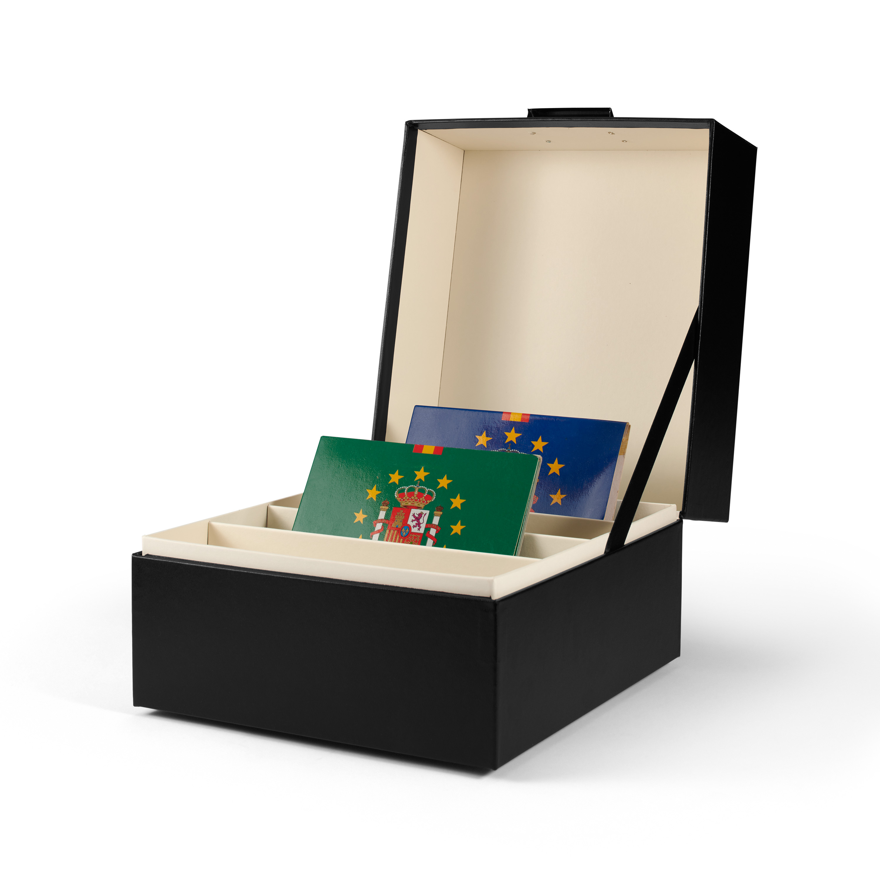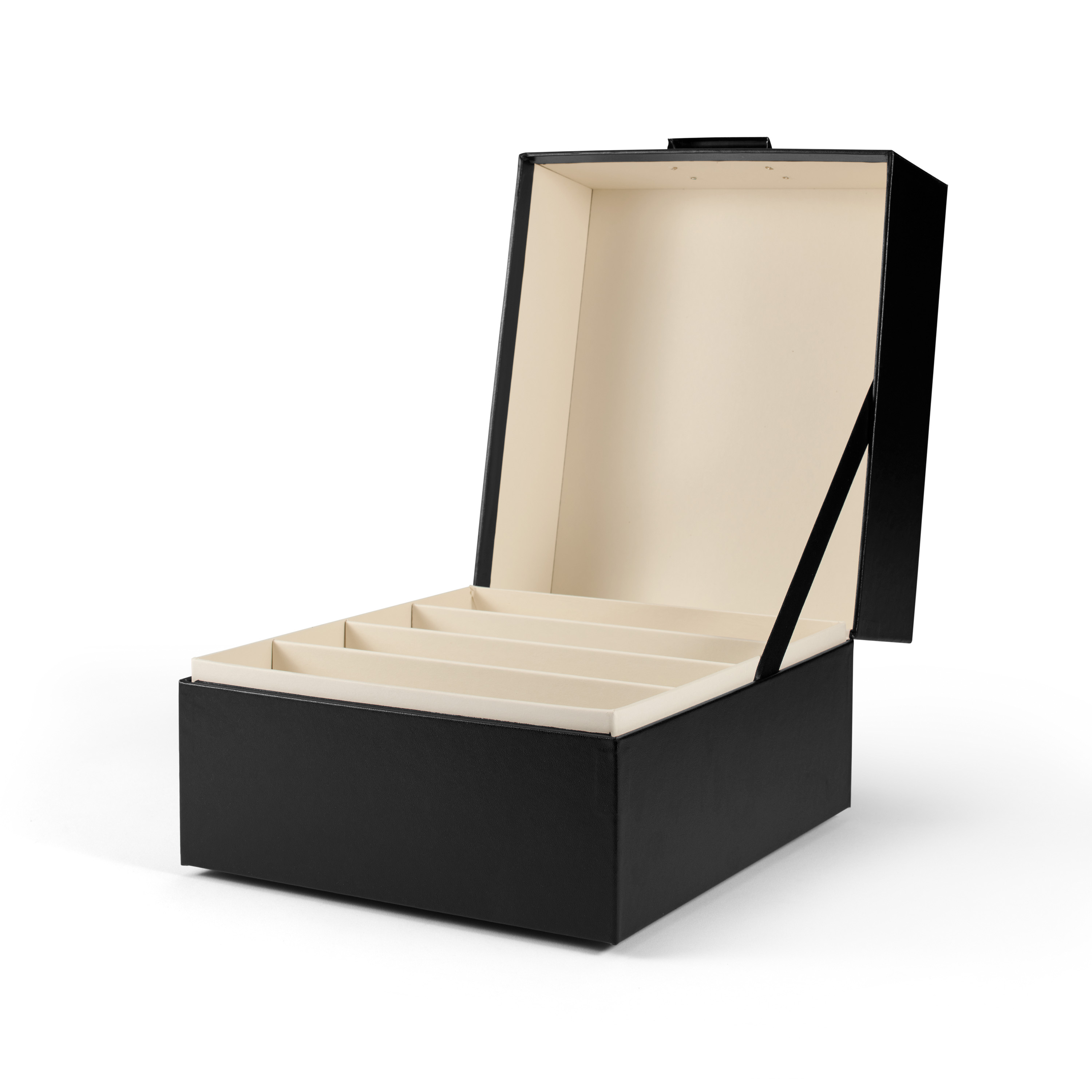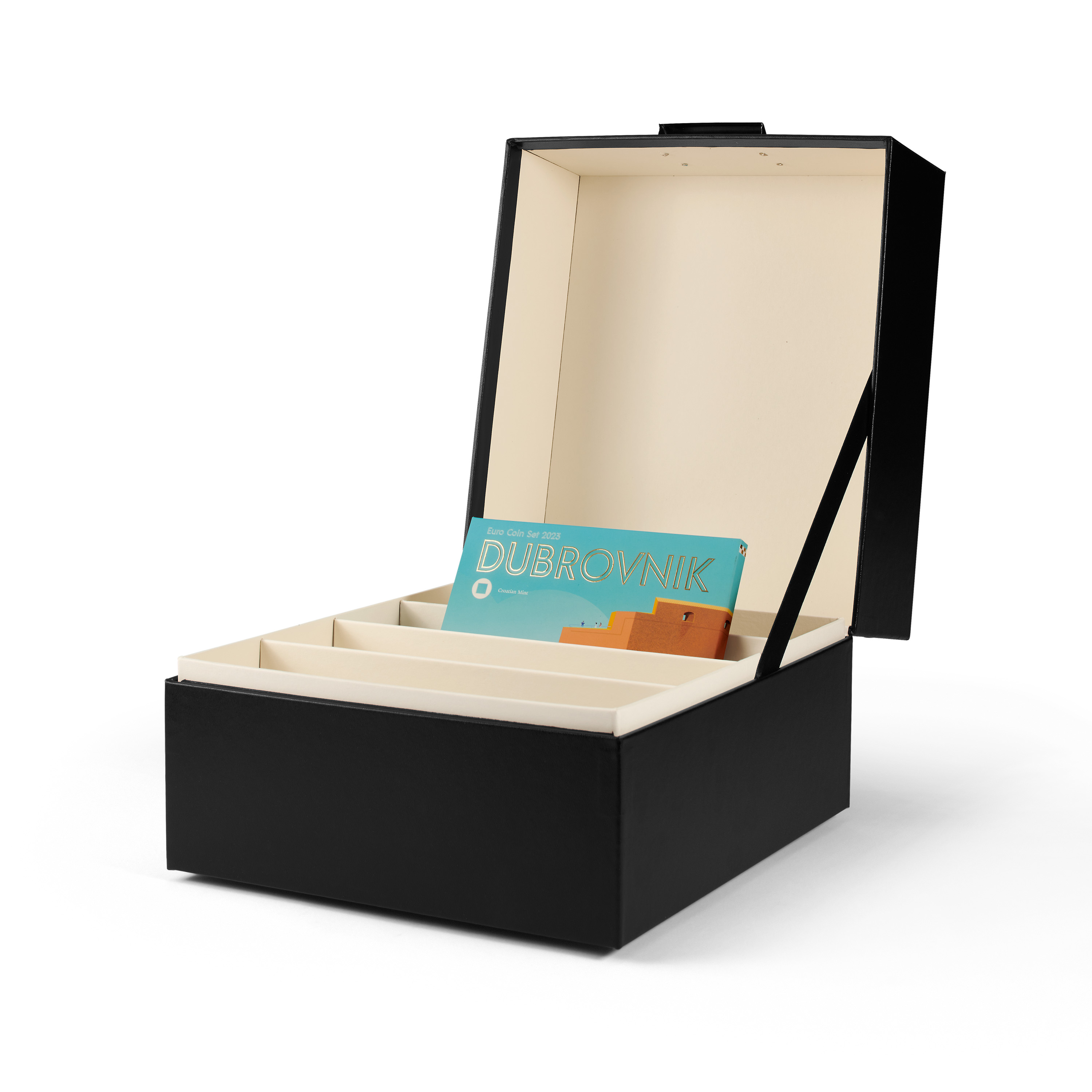 Caja archivadora de color negro para billetes, series de monedas, fichas y muchos otros objetos de coleccionismo con un tamaño de 220 x 168 mm. Con una distribución interior flexible al tener 3 separadores extraíbles. Su gran solidez ofrece una seguridad permanente. Tirador metálico con ventana para etiquetas para nombrar el contenido. Diseño moderno. Capacidad: aprox. 700 postales, 450 cartas, 500 fichas clasificadoras, 700 fichas informativas, 700 fundas de billetes y mucho más. Tamaño exterior: 230 x 173 x 270 mm