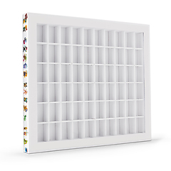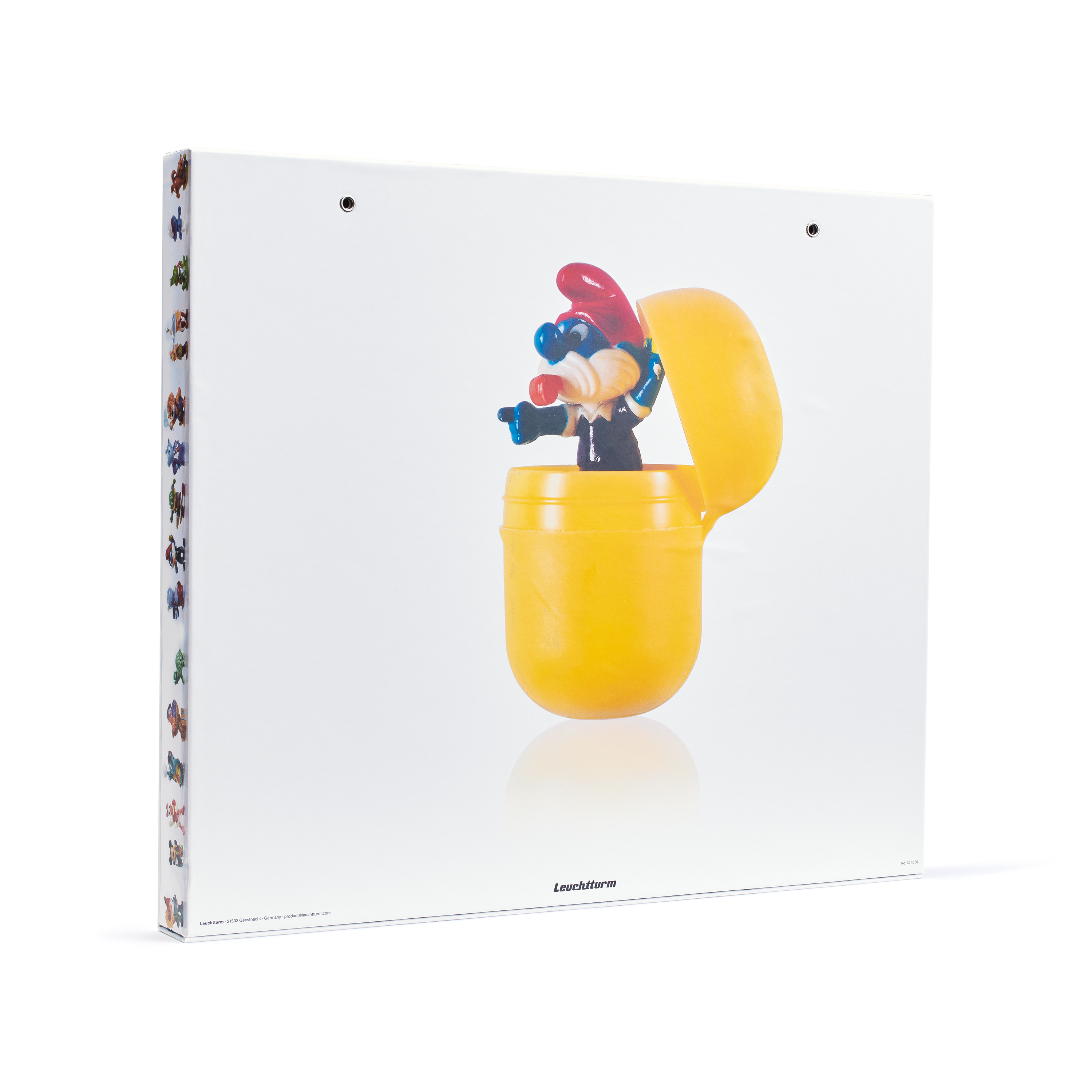 Original caja de coleccionismo para guardar 60 figuras de huevos sorpresa. La caja está adornada con imágenes divertidas y coloridas de las figuras más populares y una gran imagen de Papá Pitufo en la parte trasera. De un resistente cartón con paredes divisorias robustas. 60 divisiones de tamaño 50 x 36 x 33 mm, en donde se puede colocar una serie completa de figuras (máx. 10 figuras) en una fila. La tapa plegable, con una gran ventana y un discreto cierre magnético incorporado, presenta y al mismo tiempo protege la colección. Con ventana lateral para inscripciones para identificar y clasificar la colección. Formato exterior: 395 x 338 x 38 mm.