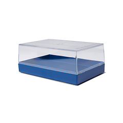 Para 100 cartones de monedas. Fabricado en plástico, con tapa transparente. Permite observar la colección sin necesidad de extraer los cartones. Varias cajas se pueden apilar. También cuenta con soportes de goma.