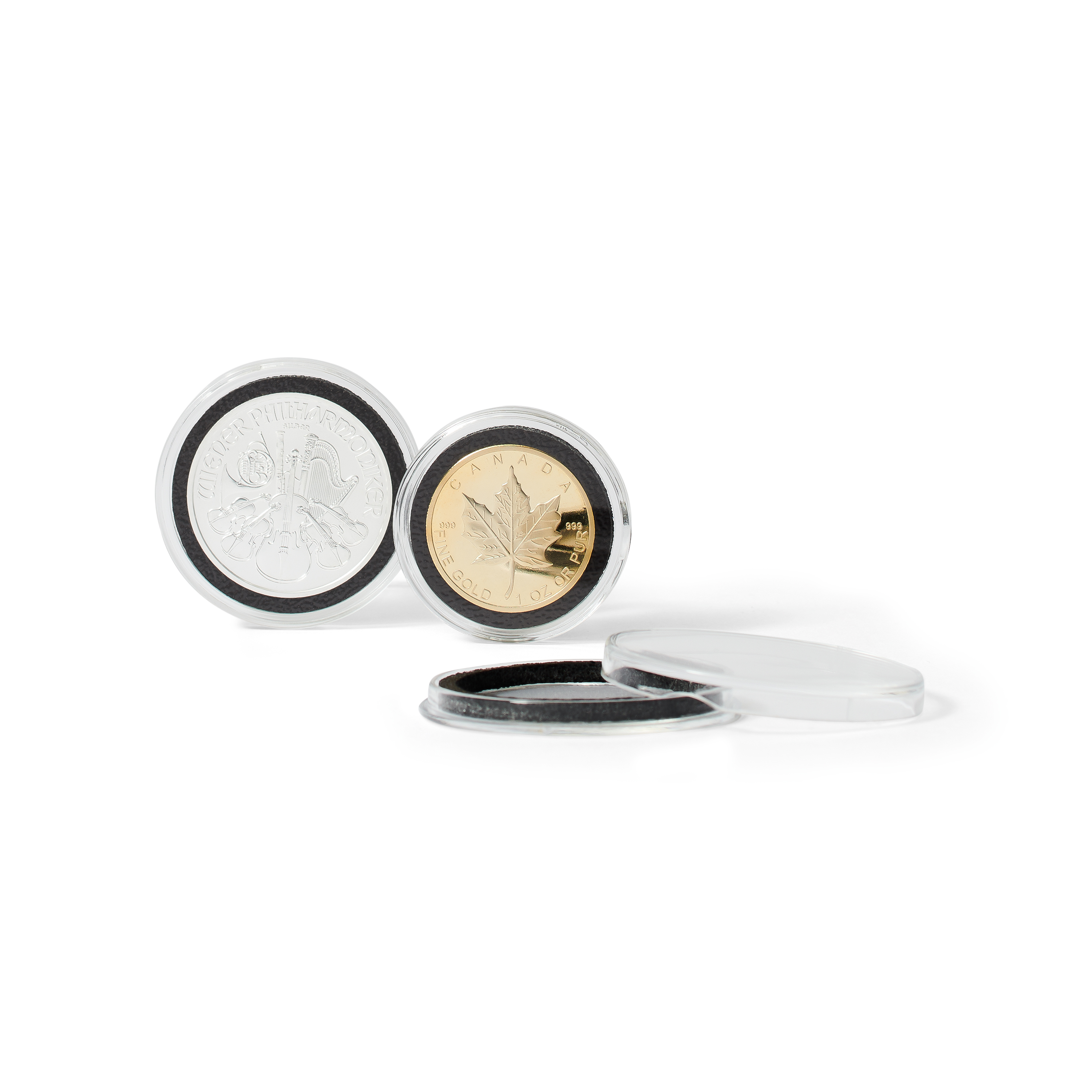 El anillo de espuma de 3 mm de espesor, insertado en las cápsulas, se basa en tecnología Intercept, patentada hace más de 30 años. Las partículas de cobre en el material neutralizan las sustancias nocivas existentes en la atmósfera, protegiendo así a las monedas de la coloración (protección garantizada durante 15 años*). La eficiencia ha sido certificada por las normativas DIN, EN, ISO y ASTM, entre otros. Disponible para todas las monedas de 26 a 41 mm de diámetro (en milímetros).