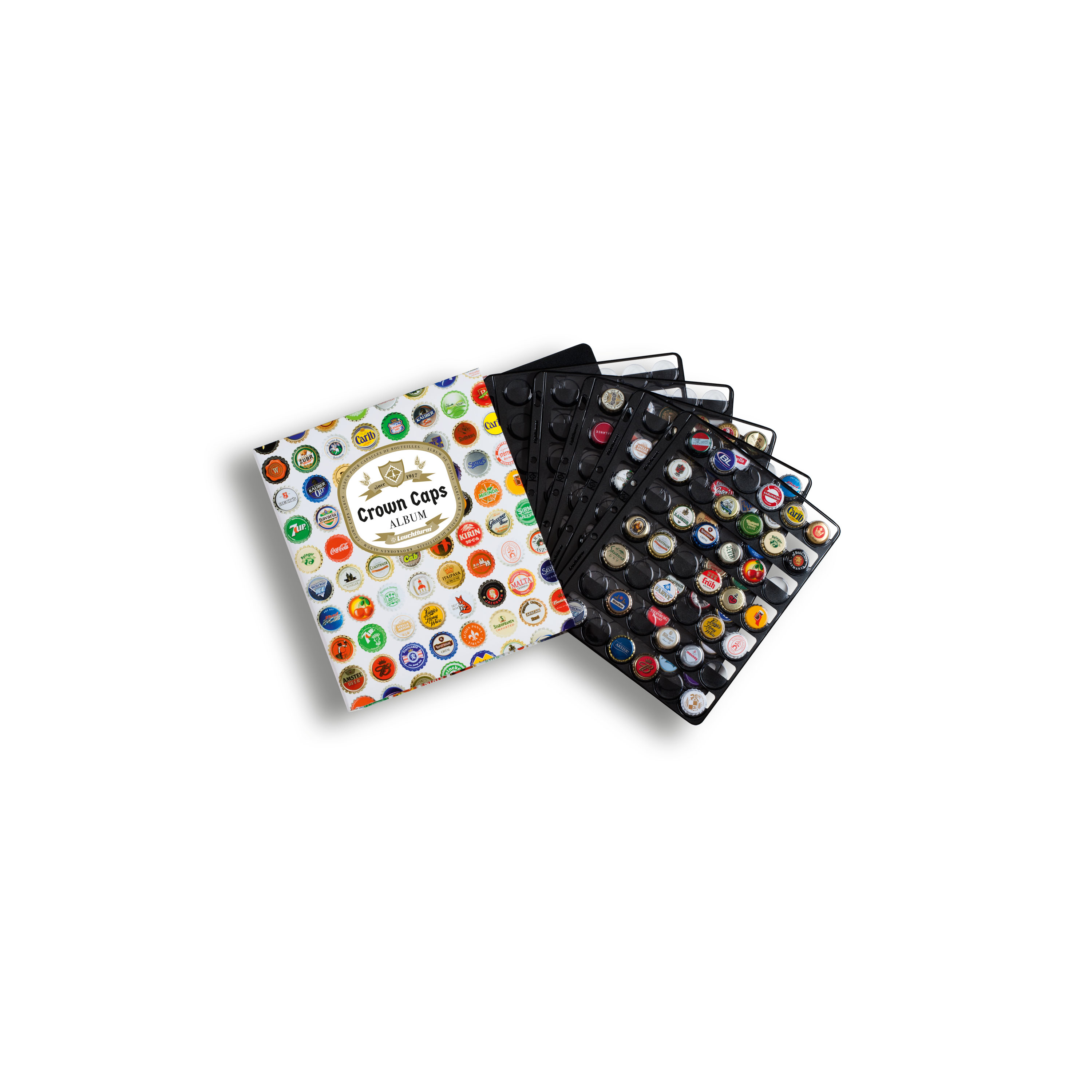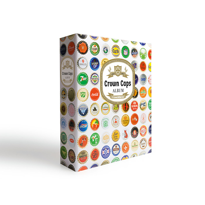 Álbum completo con título en inglés que incluye 5 fundas para 210 chapas de cerveza usadas, incluyendo 5 hojas separadoras negras. El álbum puede ampliarse gracias a sus fundas de recambio (capacidad total: 9 fundas = 378 chapas de cerveza). Cada funda tiene capacidad para 42 chapas de cerveza usadas que proporcionan una sujeción segura y protección contra los arañazos.