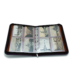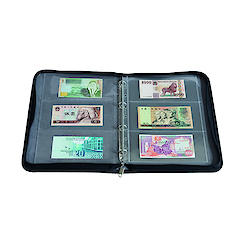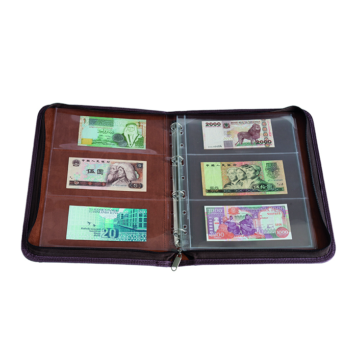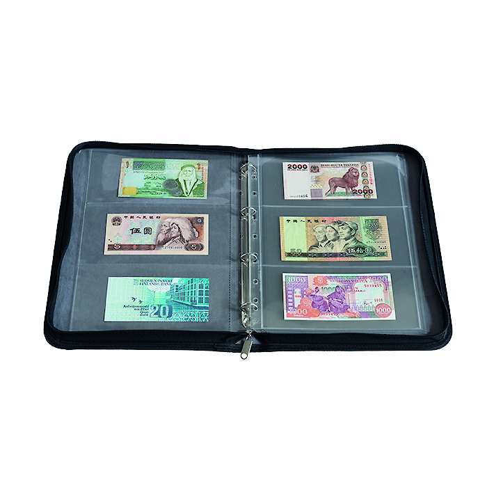 Carpeta de anillas de alta calidad "KURT" con aspecto de cuero para almacenar monedas, sellos, billetes, tarjetas postales y mucho más. Gracias a su resistente cremallera, su colección estará óptimamente protegida contra posibles daños y pérdidas. Capacidad: hasta 30 fundas GRANDE o fundas para monedas 3 ENCAP. Robusto mecanismo de anillas 4D.