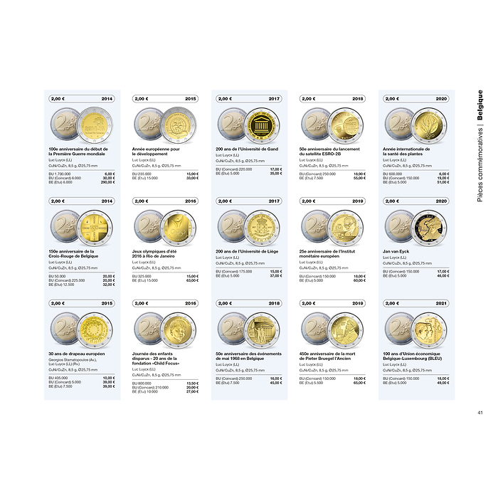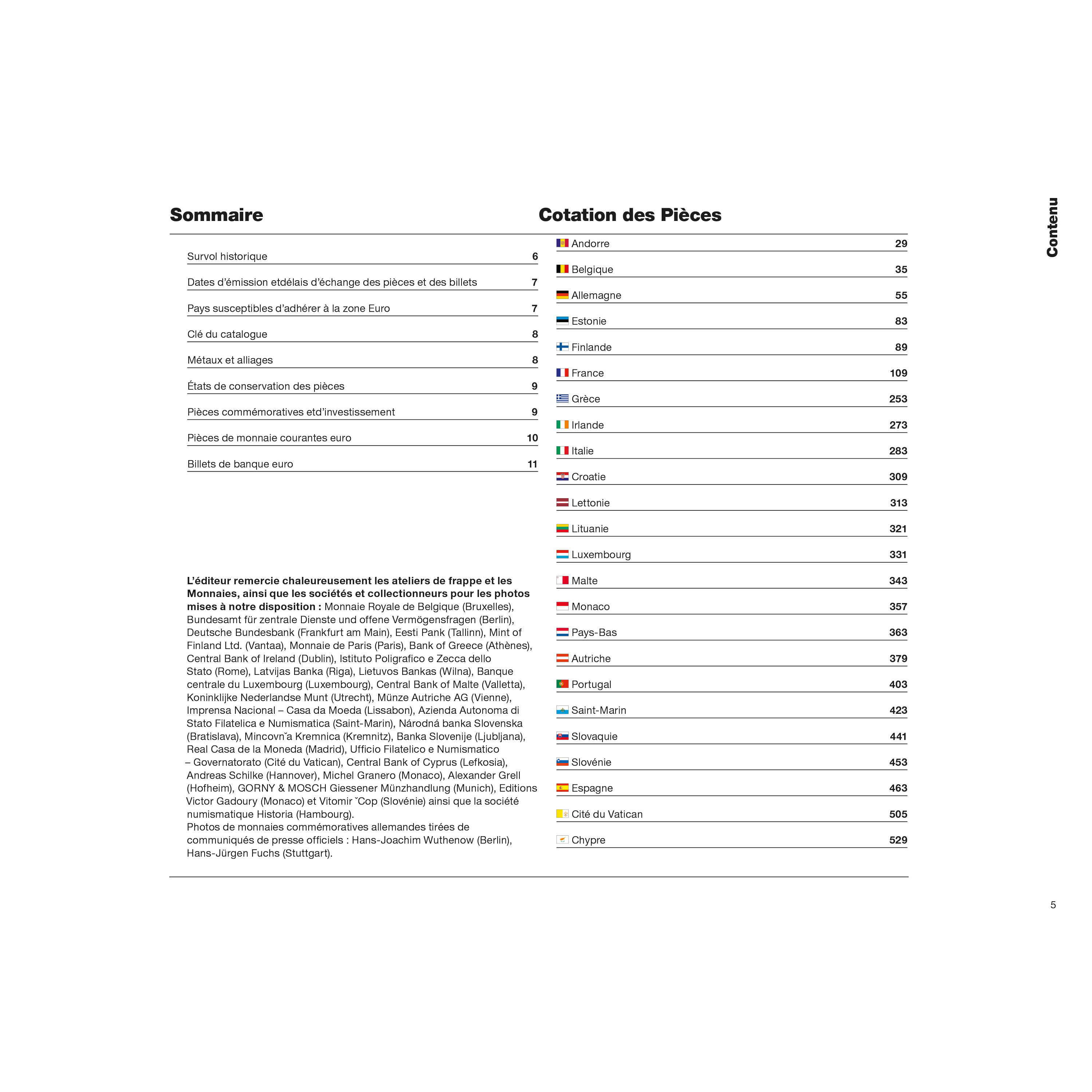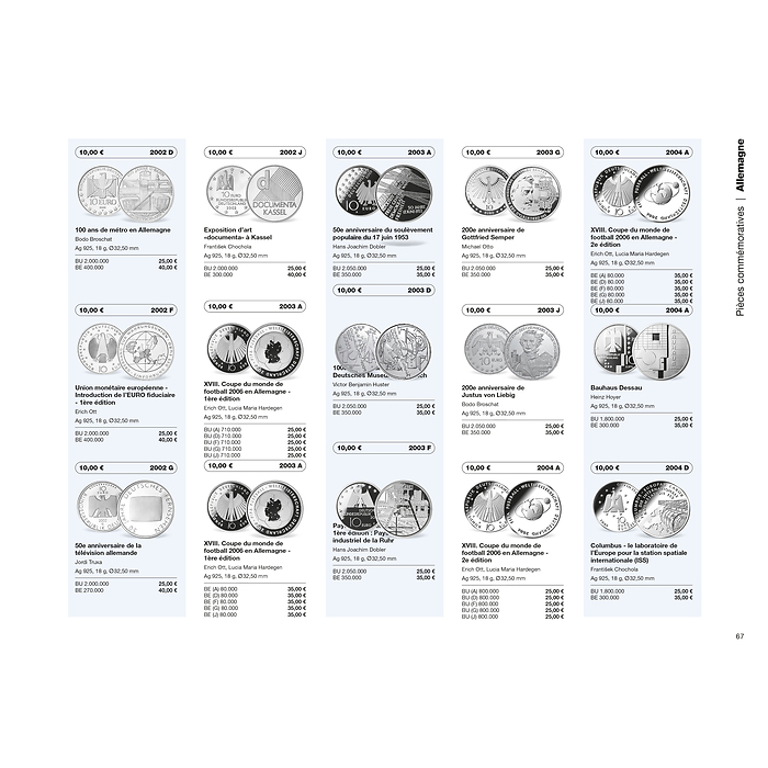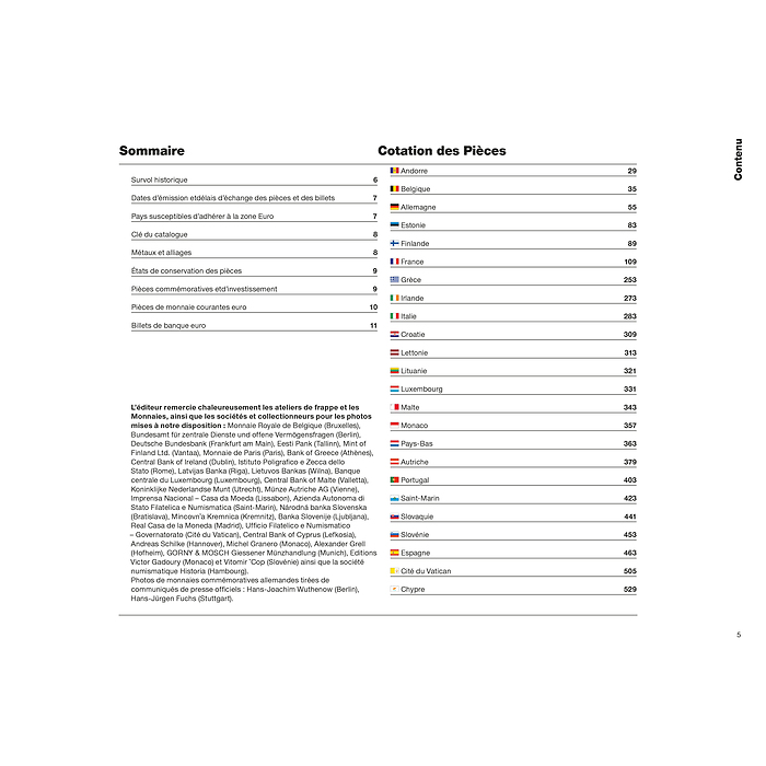 Este catálogo ofrece una presentación detallada de todos los billetes y series oficiales de monedas desde la introducción del euro en los distintos países. Además, encontrará un resumen exhaustivo de todas las monedas conmemorativas europeas de 2 euros, así como un catálogo detallado de los billetes en euros.