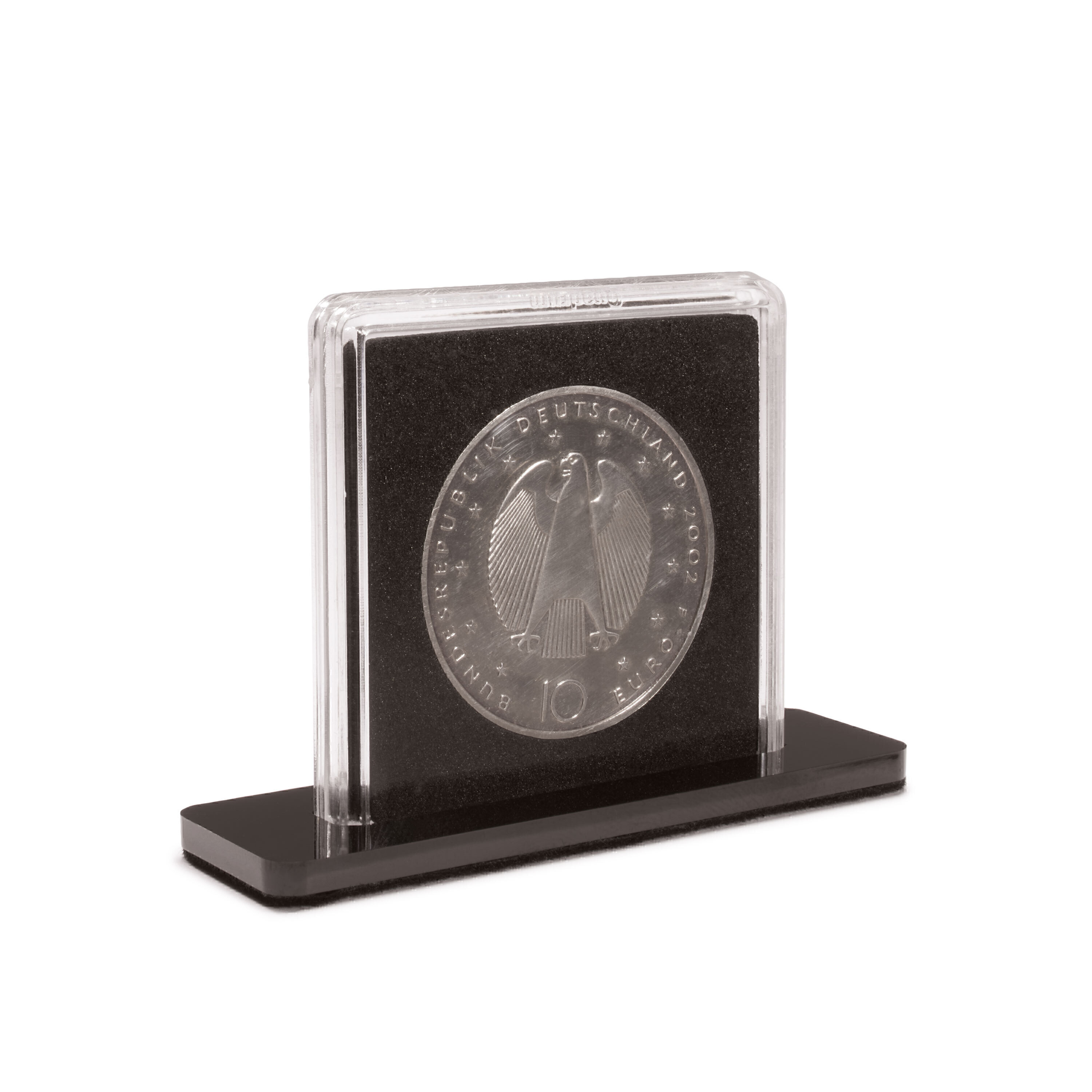 más populares de guardar monedas de forma segura y presentarlas de una forma bonita, y ahora también es posible colocar estas cápsulas cuadradas en posición vertical. El soporte para monedas QUADRUM tiene un bonito acabado lacado de piano y es así un soporte discreto y con estilo para monedas guardadas en una cápsula QUADRUM. Con un elegante diseño, será sin duda el centro de todas las miradas en cualquier vitrina de monedas. La cápsula QUADRUM se puede fijar de forma cómoda en el soporte y sacarla cuando sea necesario. La abertura está diseñada con precisión para la cápsula QUADRUM."