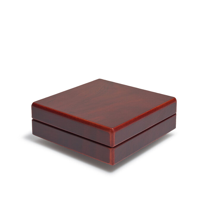 Estuche de alta calidad de madera color caoba. Interior de la tapa acolchado con raso azul, con la superficie interior aterciopelada. Para guardar una moneda con un diámetro de hasta 60 mm.