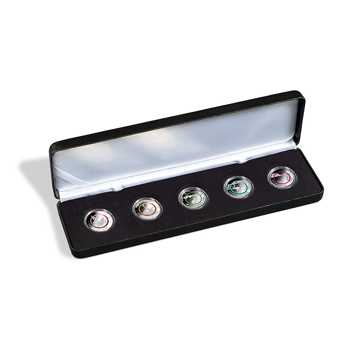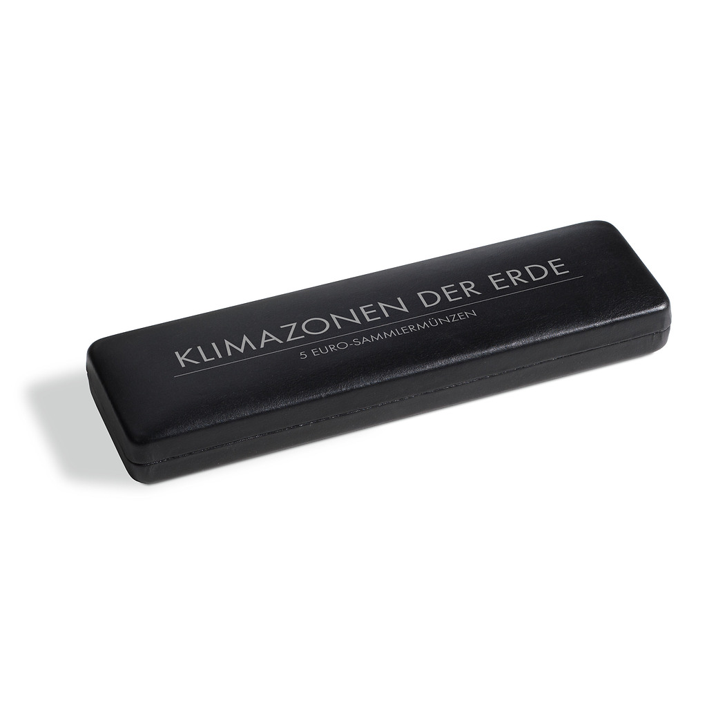Este elegante estuche en imitación a cuero es ideal para guardar 5 monedas de colección alemana de 5 euros de la serie “Zonas climáticas de la Tierra” en cápsulas (Ø interior 27 mm): p.ej. una serie completa de monedas (cecas A, D, F, G, J) o una moneda al año. Con una resistente carcasa metálica forrada y acolchada con cuero sintético de grano fino negro. Plantilla con superficie aterciopelada de color negro y 5 divisiones redondas (34 mm Ø). Interior de la tapa acolchado con raso blanco. Con una tira de raso blanco para guardar un certificado. Con una elegante estampación color plata en la tapa.