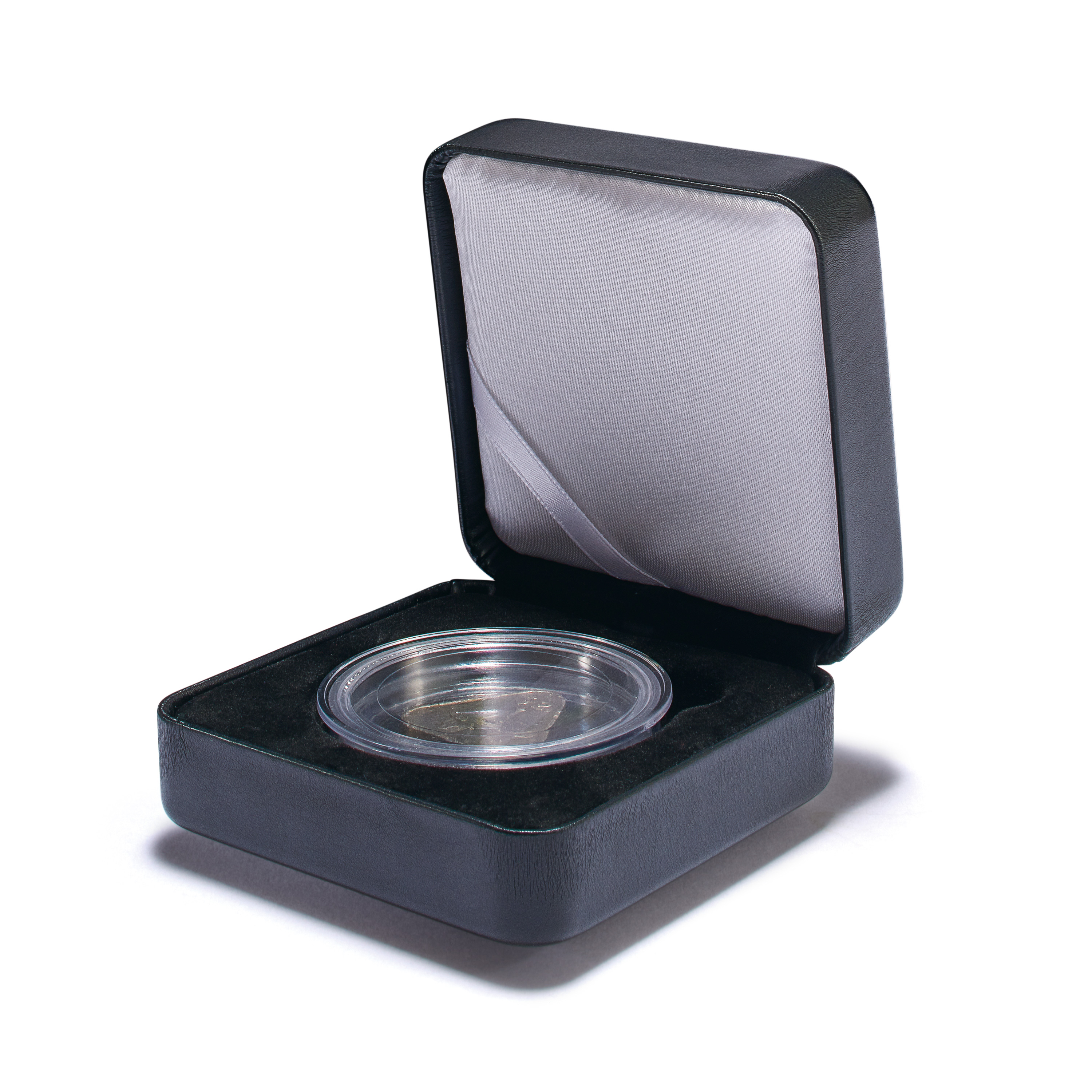 Resistente estuche de metal recubierto a su vez en imitación de cuero negro finamente graneado y acolchado. Incrustación de terciopelo con superficie negra similar al terciopelo y un campo redondo, adecuado para nuestras MAGIC CAPSULES LEUCHTTURM. En el cojín de la tapa encontrará una cinta de raso para sujetar un posible certificado. Tamaño exterior: 78 x 78 x 39 mm. Entrega sin cápsula.
