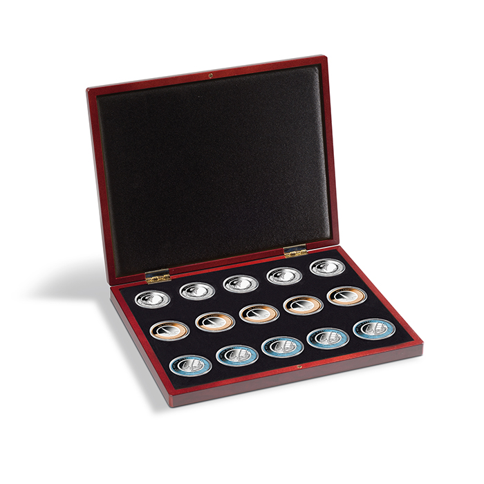 Estuche de alta calidad con un acabado en madera color caoba para guardar 15 monedas de colección alemanas de 10 euros de la serie “Aire mueve” (cecas alemanas A, D, F, G, J) en cápsulas (Ø interior 29 mm). Una plantilla con superficie aterciopelada de color negro y 15 espacios redondos (Ø 35 mm). Una elegante estampación color plata en la tapa con el motivo de la premiera moneda de colección alemana de 10 euros “En el aire”. Interior de la tapa acolchado con raso negro. Tamaño exterior: 251 x 30 x 203 mm. Las cápsulas no están incluidas.