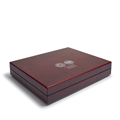 El estuche VOLTERRA DE LUXE de alta calidad contiene 3 bandejas para 61 monedas conmemorativas alemanas en cápsulas (GRIPS 32.5)* de 10 DM de los años 1987-2001. Dos de las bandejas tienen 20 divisiones redondas cada una (38 mm) y la tercera tiene 21. Estuche de madera de color caoba con bandejas de superficie aterciopelada, inscripción del año correspondiente, grabado en tapa e interior y cierre magnético. Formato exterior: 330 x 55 x 270 mm.