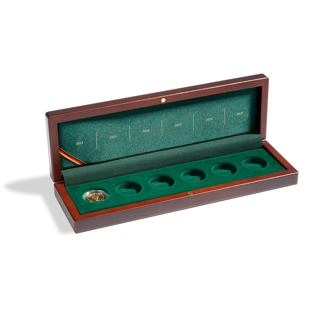 Este álbum de monedas es ideal para guardar todas las monedas conmemorativas alemanas de 20 euros. Contiene fundas para monedas y hojas preimpresas con ilustraciones, detalles técnicos e información histórica sobre cada una de las monedas. El álbum, volumen 2, abarca los años a partir de 2024. El archivador está equipado con un robusto mecanismo de anillas y se suministra con un estuche protector a juego. Con un formato exterior de 250×280×65 mm, el álbum ofrece una forma compacta pero elegante de guardar con seguridad su colección de monedas. El álbum se actualiza con suplementos anuales.