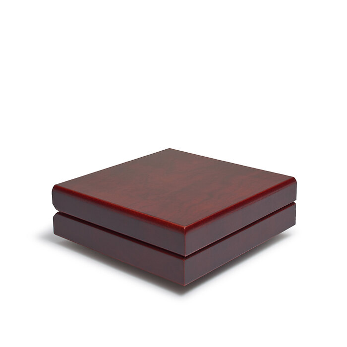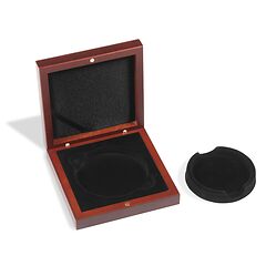 Estuche VOLTERRA de madera color caoba para 1 cápsula GRIPS XL 21–62 o 1 cápsula GRIPS XL 29–76. Interior de la tapa acolchado con raso negro. Bandeja aterciopelada negra de dos piezas, cada parte con una división (Ø 67,5 mm & Ø 82,5 mm), extraíble. Con una tira de raso para guardar certificados. Formato exterior: 120 x 120 mm.