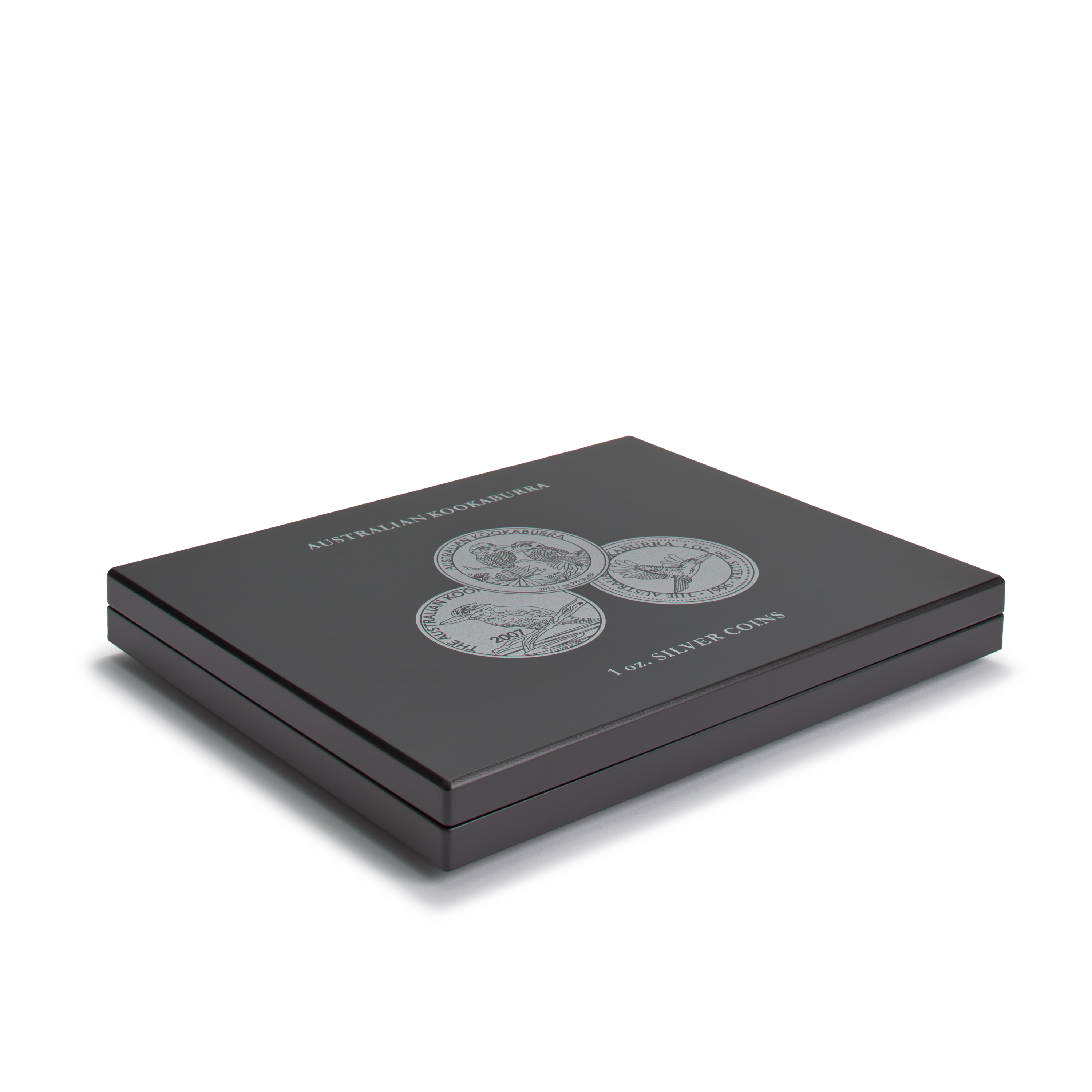 Elegante estuche de color negro para guardar 20 monedas de plata Kookaburra (modelo de 1 oz.) en cápsulas originales. 1 bandeja con superficie aterciopelada de color negro y 20 divisiones redondas (45.4 mm Ø). Con grabados en color plata en la tapa y en su parte interior con motivos de las monedas Kookaburra. Interior de la tapa acolchado con raso negro. Con un cierre magnético seguro y discreto. Formato exterior: 305 x 30 x 245 mm