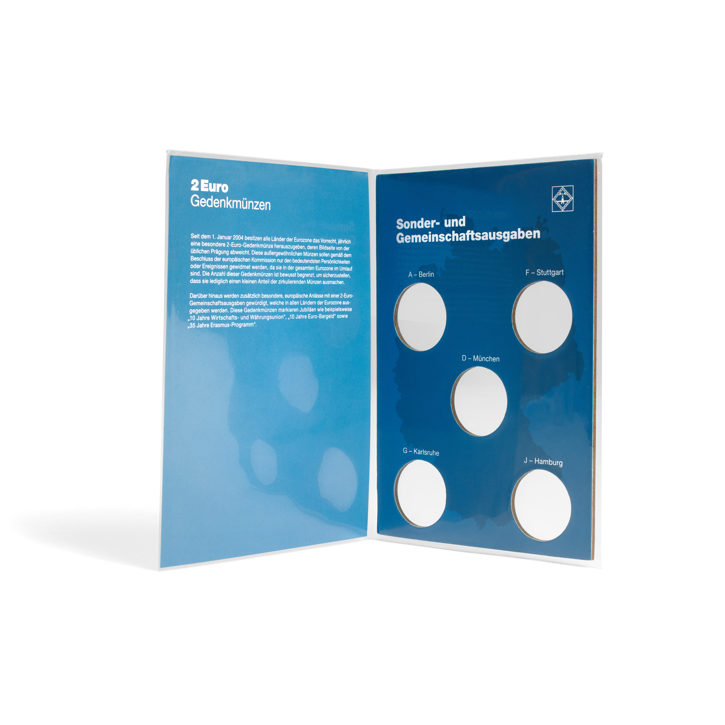 Tarjeta de un resistente cartón con perforaciones para las 5 monedas conmemorativas alemanas de 2 euros en edición neutral para utilizar individualmente. Guardada en una lámina de plástico transparente sin plastificantes. Las monedas se pueden ver por los dos lados. Con opciones de rotulación de la parte delantera. Tamaño exterior: 106 x 144 mm. Ideal para hacer un regalo.