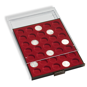 Gabinete de alta calidad en color caoba para 10 bandejas de monedas MB ó 6 bandejas XL. Gracias a su elegante aspecto, se puede utilizar también como un atractivo mueble. Interior forrado con fieltro claro, con cerradura (2 llaves). Formato exterior: 260 x 230 x 343 mm. Atención: Las bandejas no están incluidas