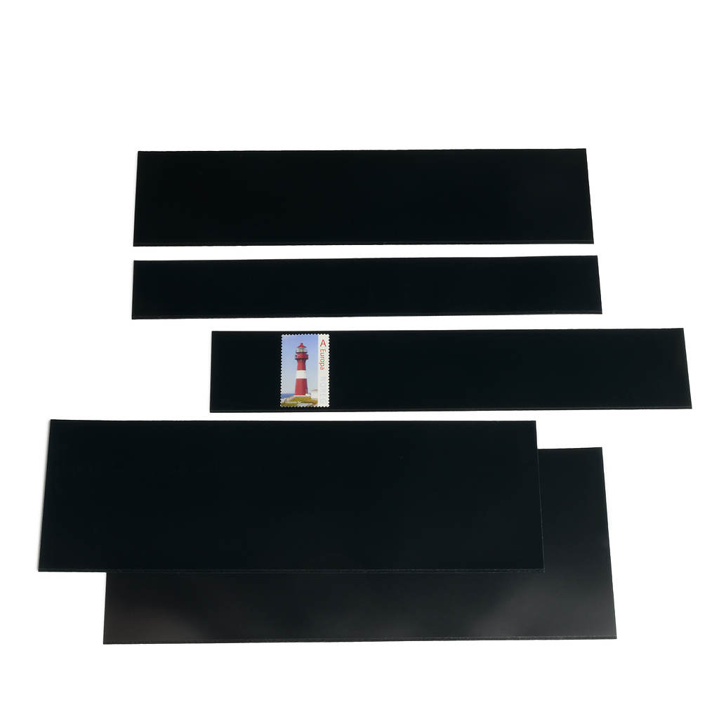 Las tiras tienen 217 mm de largo y pueden ser cortadas en las medidas deseadas. Con los filoestuches negros puede verse el dentado de los sellos y es como si los sellos tuvieran un „marco“.