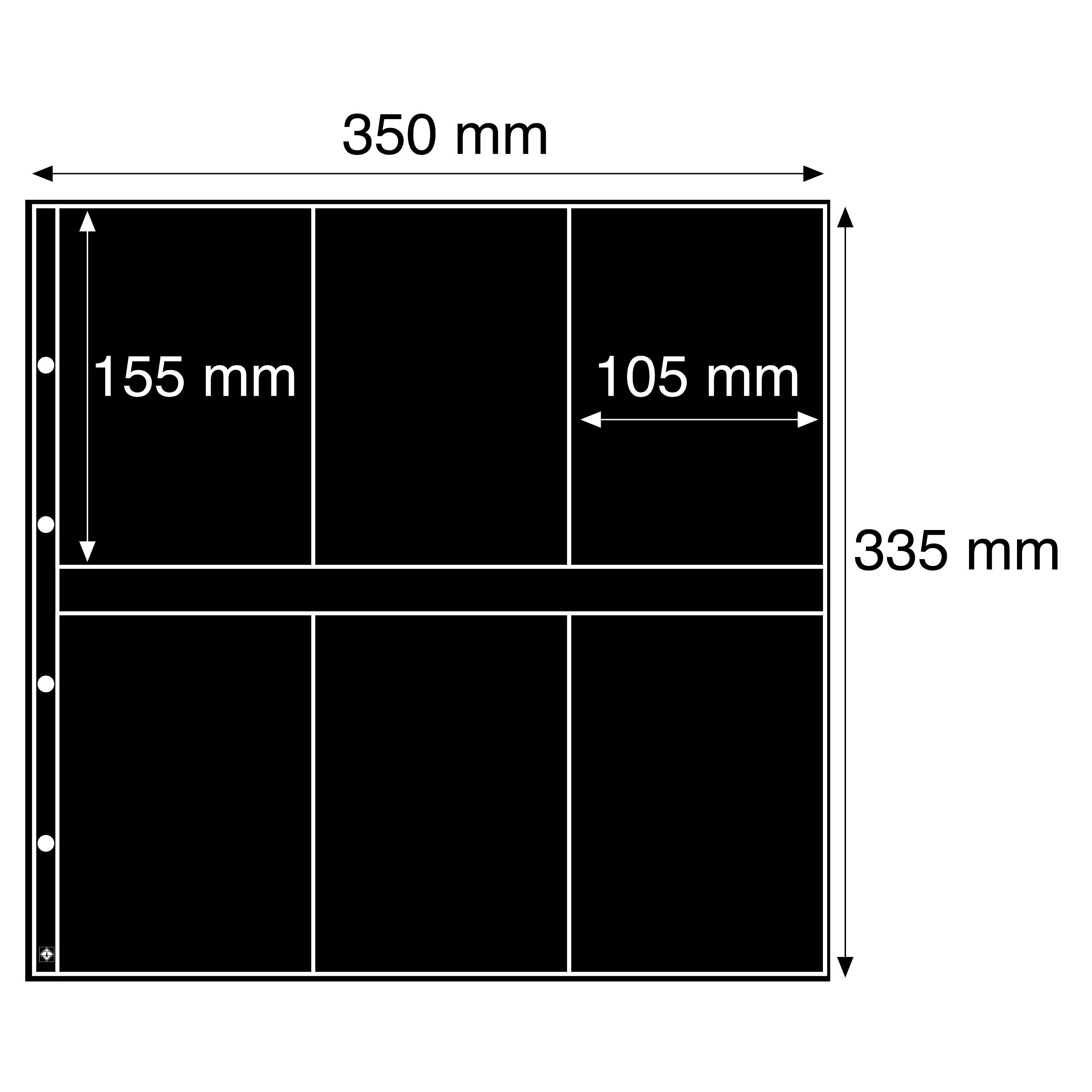Hojas MAXIMUM en negro para tarjetas postales con 6 divisiones verticales. Material libre de ácido y plastificante. Formato exterior: 35x335 mm. Formato interior de cada division: 15x155 mm.