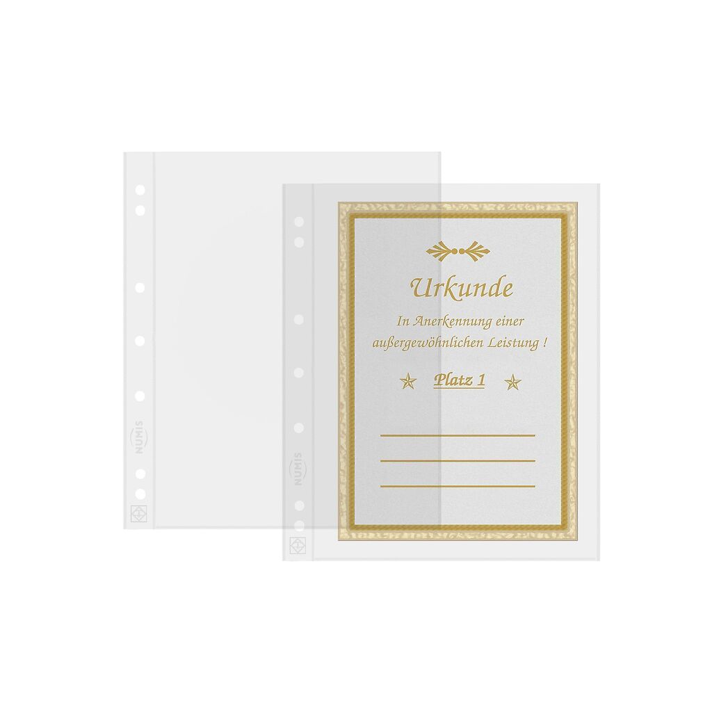 Hojas NUMIS para guardar series de monedas hasta el formato 165 x 219 mm. Con 1 división. Contenido del paquete: 10 unidades sin hojas separadoras blancas de cartón. Formato: 193 x 217 mm.