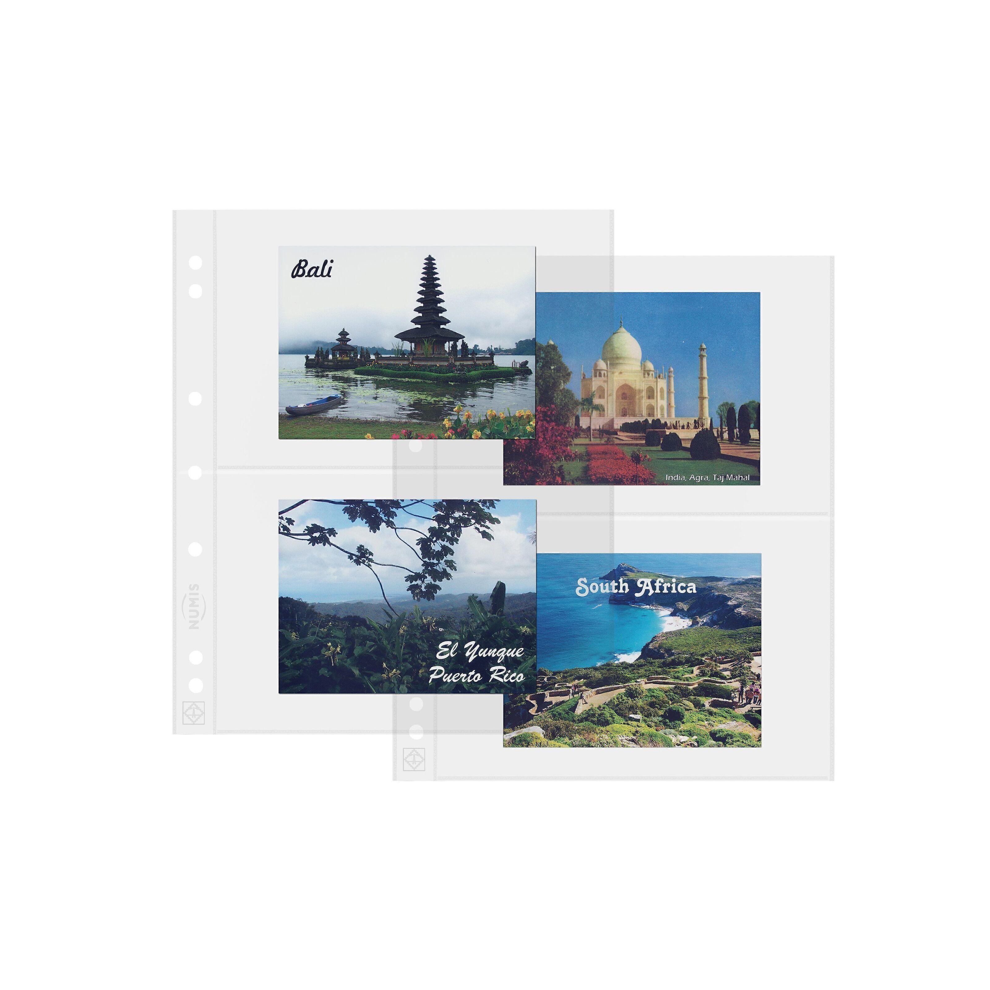 Hojas NUMIS para guardar billetes de banco y tarjetas postales hasta el formato 165 x 107 mm. Con 2 divisiones. Contenido del paquete: 10 unidades sin hojas separadoras blancas de cartón. Formato: 193 x 217 mm.