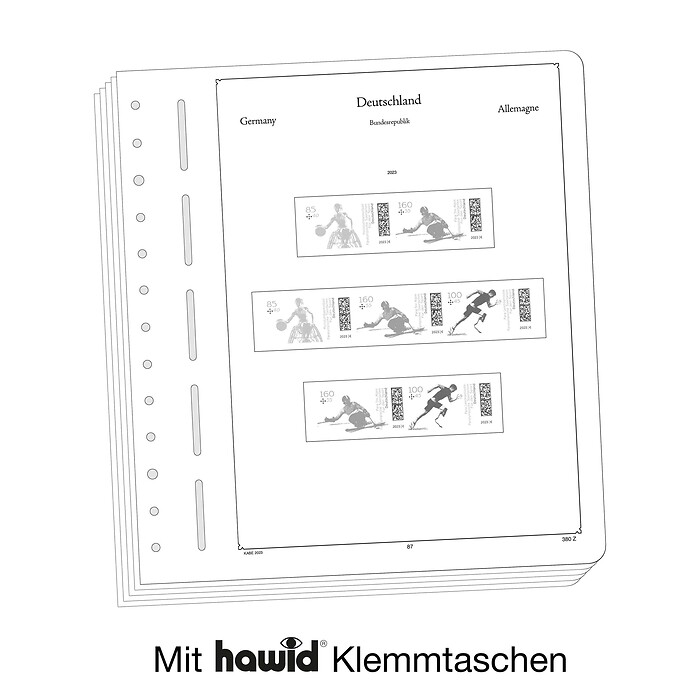 Los álbumes preimpresos KABE (formato 275 x 310 mm) están impresos en cartón de madera sin ácidos (175 g/m2), resistente al envejecimiento y con impresión offset en blanco y negro que reproduce fielmente los detalles. De esta forma, usted puede encontrar rápidamente los sellos que todavía le faltan. Sobre la impresión de los sellos y con el mismo tamaño, están pegados filoestuches-SF fabricados en poliestirol transparente, antireflectante y sin plastificantes. Estos filoestuches sujetan los sellos, a la vez que ofrecen una máxima protección contra el polvo y la humedad. La articulación doble de lino facilita la apertura de las hojas y ayuda para su mejor conservación.