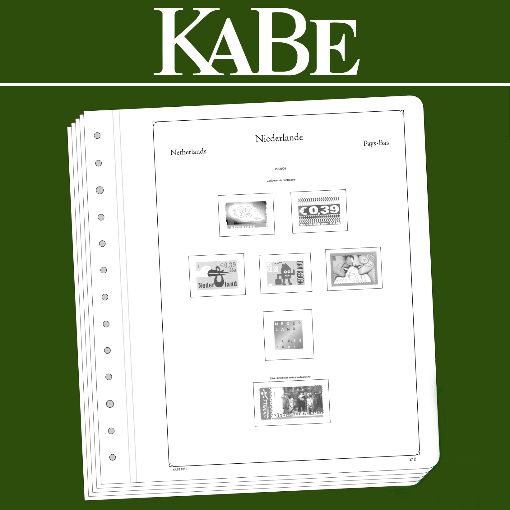 Los álbumes preimpresos KABE (formato 275 x 310 mm) están impresos en cartón de madera sin ácidos (175 g/m2), resistente al envejecimiento y con impresión offset en blanco y negro que reproduce fielmente los detalles. De esta forma, usted puede encontrar rápidamente los sellos que todavía le faltan. Sobre la impresión de los sellos y con el mismo tamaño, están pegados filoestuches-SF fabricados en poliestirol transparente, antireflectante y sin plastificantes. Estos filoestuches sujetan los sellos, a la vez que ofrecen una máxima protección contra el polvo y la humedad. La articulación doble de lino facilita la apertura de las hojas y ayuda para su mejor conservación.