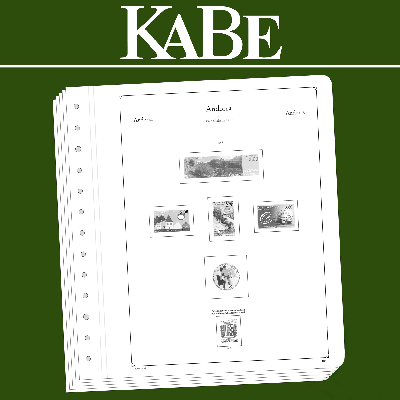 Los álbumes preimpresos KABE (formato 275 x 310 mm) están impresos en cartón de madera sin ácidos (175 g/m2), resistente al envejecimiento y con impresión offset en blanco y negro que reproduce fielmente los detalles. De esta forma, usted puede encontrar rápidamente los sellos que todavía le faltan. Sobre la impresión de los sellos y con el mismo tamaño, están pegados filoestuches-SF fabricados en poliestirol transparente, antireflectante y sin plastificantes. Estos filoestuches sujetan los sellos, a la vez que ofrecen una máxima protección contra el polvo y la humedad. La articulación doble de lino facilita la apertura de las hojas y ayuda para su mejor conservación.