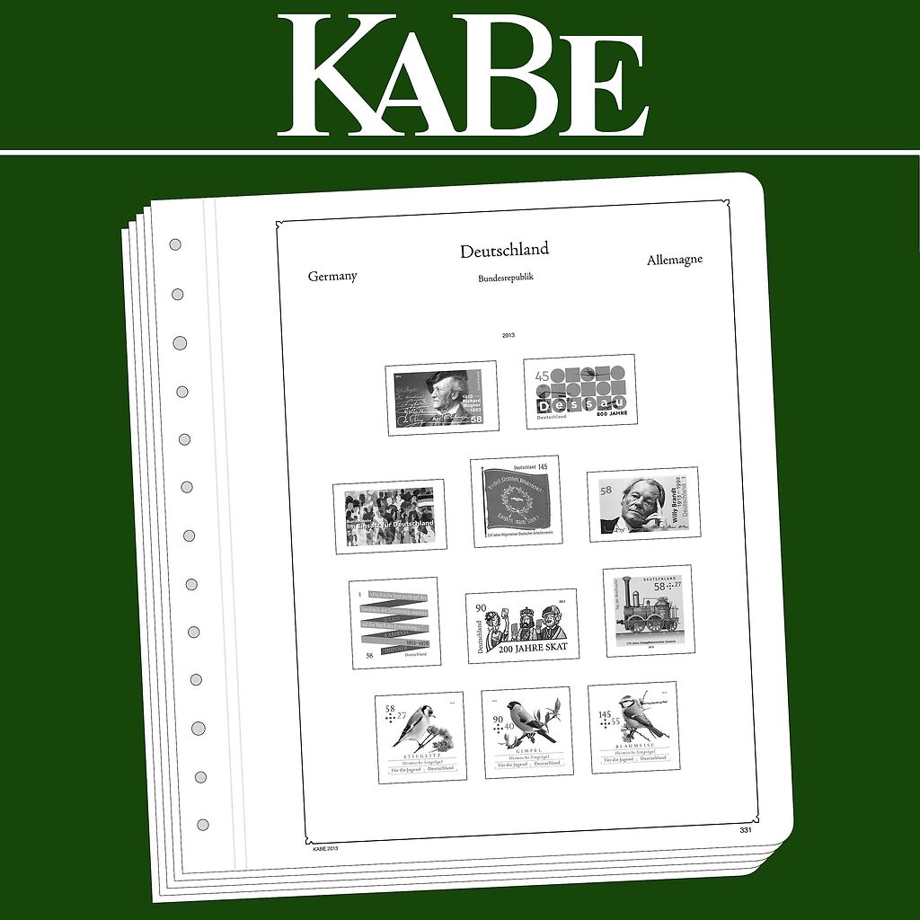 Los álbumes preimpresos KABE (formato 275 x 310 mm) están impresos en cartón de madera sin ácidos (175 g/m2), resistente al envejecimiento y con impresión offset en blanco y negro que reproduce fielmente los detalles. De esta forma, usted puede encontrar rápidamente los sellos que todavía le faltan. Sobre la impresión de los sellos y con el mismo tamaño, están pegados filoestuches-SF fabricados en poliestirol transparente, antireflectante y sin plastificantes. Estos filoestuches sujetan los sellos, a la vez que ofrecen una máxima protección contra el polvo y la humedad. La articulación doble de lino facilita la apertura de las hojas y ayuda para su mejor conservación.