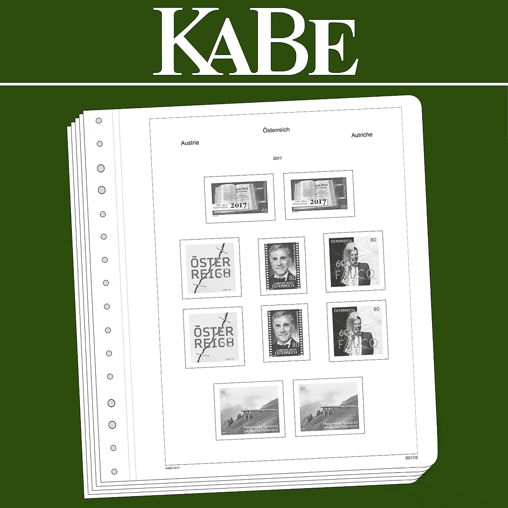 Los álbumes preimpresos KABE (formato 275 x 310 mm) están impresos en cartón de madera sin ácidos (175 g/m2), resistente al envejecimiento y con impresión offset en blanco y negro que reproduce fielmente los detalles. De esta forma, usted puede encontrar rápidamente los sellos que todavía le faltan. Sobre la impresión de los sellos y con el mismo tamaño, están pegados filoestuches-SF fabricados en poliestirol transparente, antireflectante y sin plastificantes. Estos filoestuches sujetan los sellos, a la vez que ofrecen una máxima protección contra el polvo y la humedad. La articulación doble de lino facilita la apertura de las hojas y ayuda para su mejor conservación.