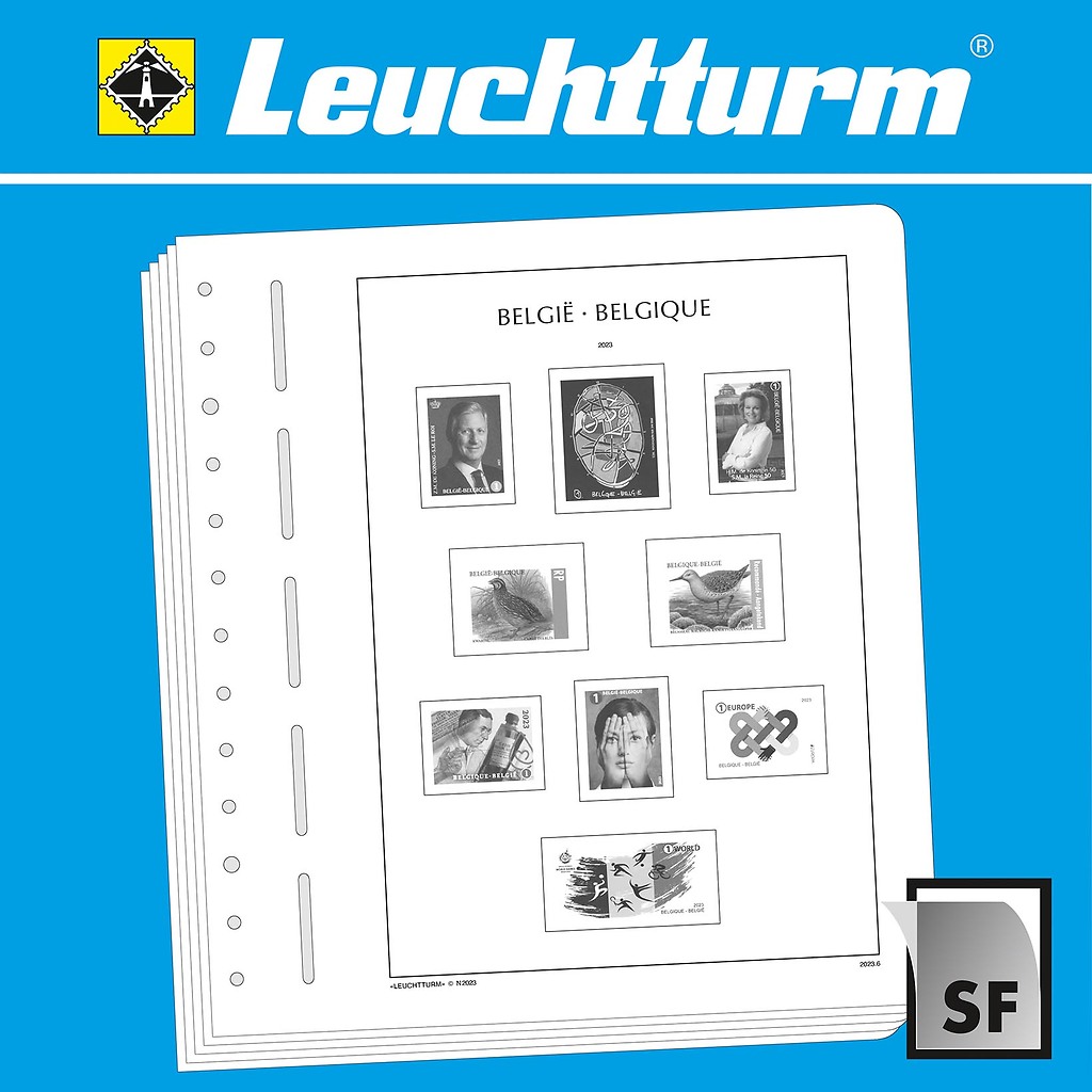 Los álbumes preimpresos LEUCHTTURM (formato 270 x 297 mm, perforación de 13 agujeros) están impresos en cartón de madera sin ácidos (170 g/m2), resistente al envejecimiento y con impresión offset en blanco y negro que reproduce fielmente los detalles. De esta forma, usted puede encontrar rápidamente los sellos que todavía le faltan. Sobre la impresión de los sellos y con el mismo tamaño, están pegados filoestuches-SF fabricados en poliestirol transparente, antireflectante y sin plastificantes. Estos filoestuches sujetan los sellos, a la vez que ofrecen una máxima protección contra el polvo y la humedad.