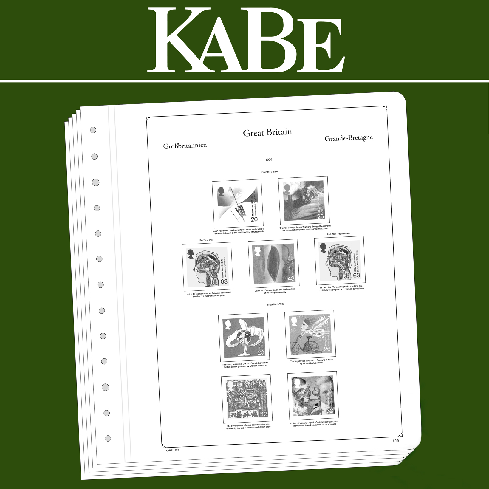 Los álbumes preimpresos KABE (formato 275 x 310 mm) están impresos en cartón de madera sin ácidos (175 g/m2), resistente al envejecimiento y con impresión offset en blanco y negro que reproduce fielmente los detalles. De esta forma, usted puede encontrar rápidamente los sellos que todavía le faltan. Sobre la impresión de los sellos y con el mismo tamaño, están pegados filoestuches-SF fabricados en poliestirol transparente, antireflectante y sin plastificantes. Estos filoestuches sujetan los sellos, a la vez que ofrecen una máxima protección contra el polvo y la humedad. La articulación doble de lino facilita la apertura de las hojas y ayuda para su mejor conservación.