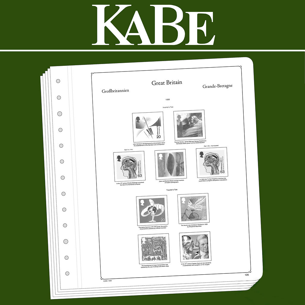 Los álbumes preimpresos KABE (formato 275 x 310 mm) están impresos en cartón de madera sin ácidos (175 g/m2), resistente al envejecimiento y con impresión offset en blanco y negro que reproduce fielmente los detalles. De esta forma, usted puede encontrar rápidamente los sellos que todavía le faltan. Sobre la impresión de los sellos y con el mismo tamaño, están pegados filoestuches-SF fabricados en poliestirol transparente, antireflectante y sin plastificantes. Estos filoestuches sujetan los sellos, a la vez que ofrecen una máxima protección contra el polvo y la humedad. La articulación doble de lino facilita la apertura de las hojas y ayuda para su mejor conservación.