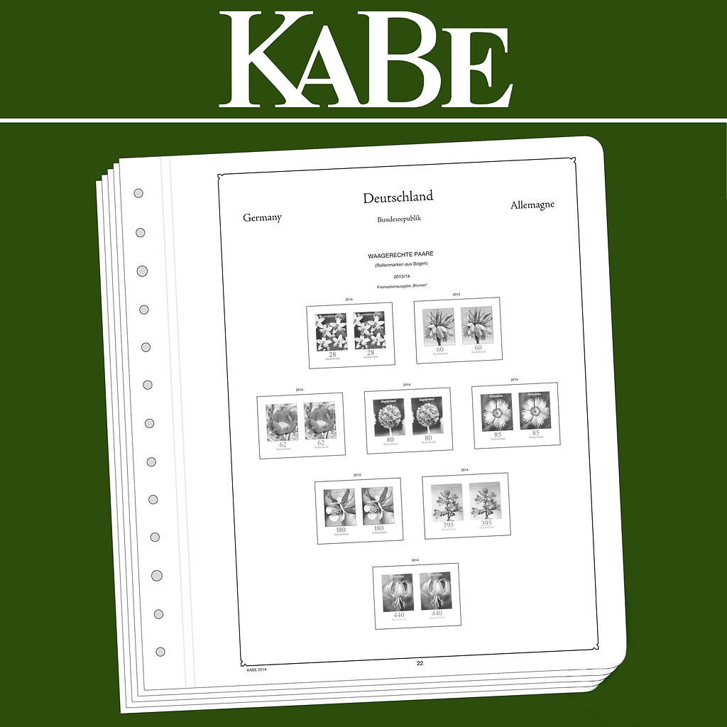 Los álbumes preimpresos KABE (formato 275 x 310 mm) están impresos en cartón de madera sin ácidos (175 g/m2), resistente al envejecimiento y con impresión offset en blanco y negro que reproduce fielmente los detalles. De esta forma, usted puede encontrar rápidamente los sellos que todavía le faltan. Sobre la impresión de los sellos y con el mismo tamaño, están pegados filoestuches-SF fabricados en poliestirol transparente, antireflectante y sin plastificantes. Estos filoestuches sujetan los sellos, a la vez que ofrecen una máxima protección contra el polvo y la humedad. La articulación doble de lino facilita la apertura de las hojas y ayuda para su mejor conservación.