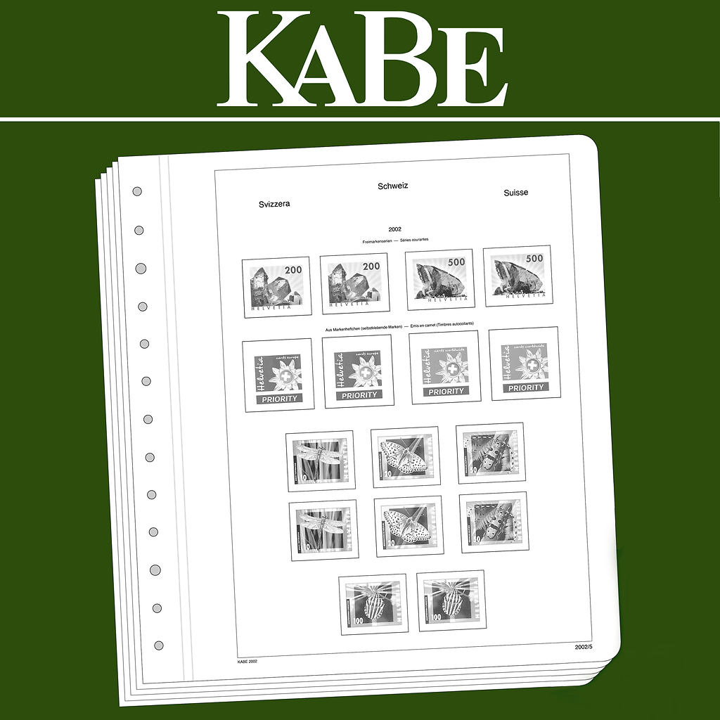 Los álbumes preimpresos KABE (formato 275 x 310 mm) están impresos en cartón de madera sin ácidos(175 g/m2), resistente al envejecimiento y con impresión offset en blanco y negro que reproduce fielmente los detalles. De esta forma, usted puede encontrar rápidamente los sellos que todavía le faltan. Sobre la impresión de los sellos y con el mismo tamaño, están pegados filoestuches-SF fabricados en poliestirol transparente, antireflectante y sin plastificantes. Estos filoestuches sujetan los sellos, a la vez que ofrecen una máxima protección contra el polvo y la humedad. La articulación doble de lino facilita la apertura de las hojas y ayuda para su mejor conservación.