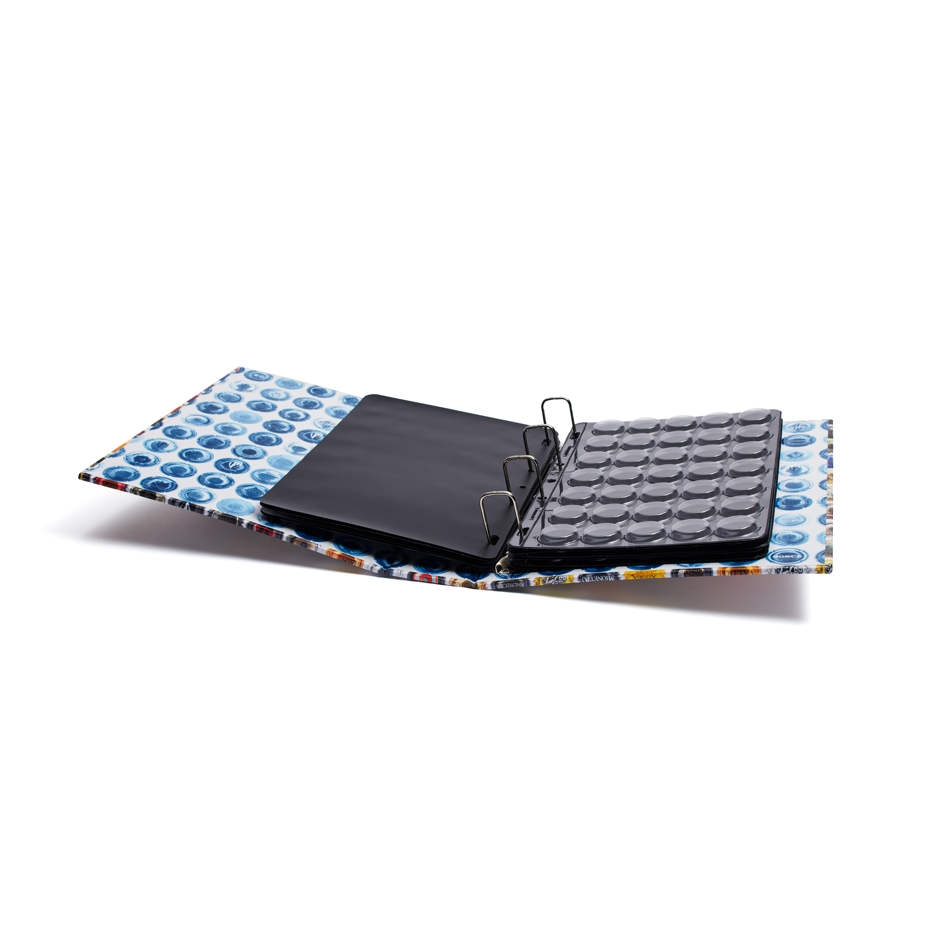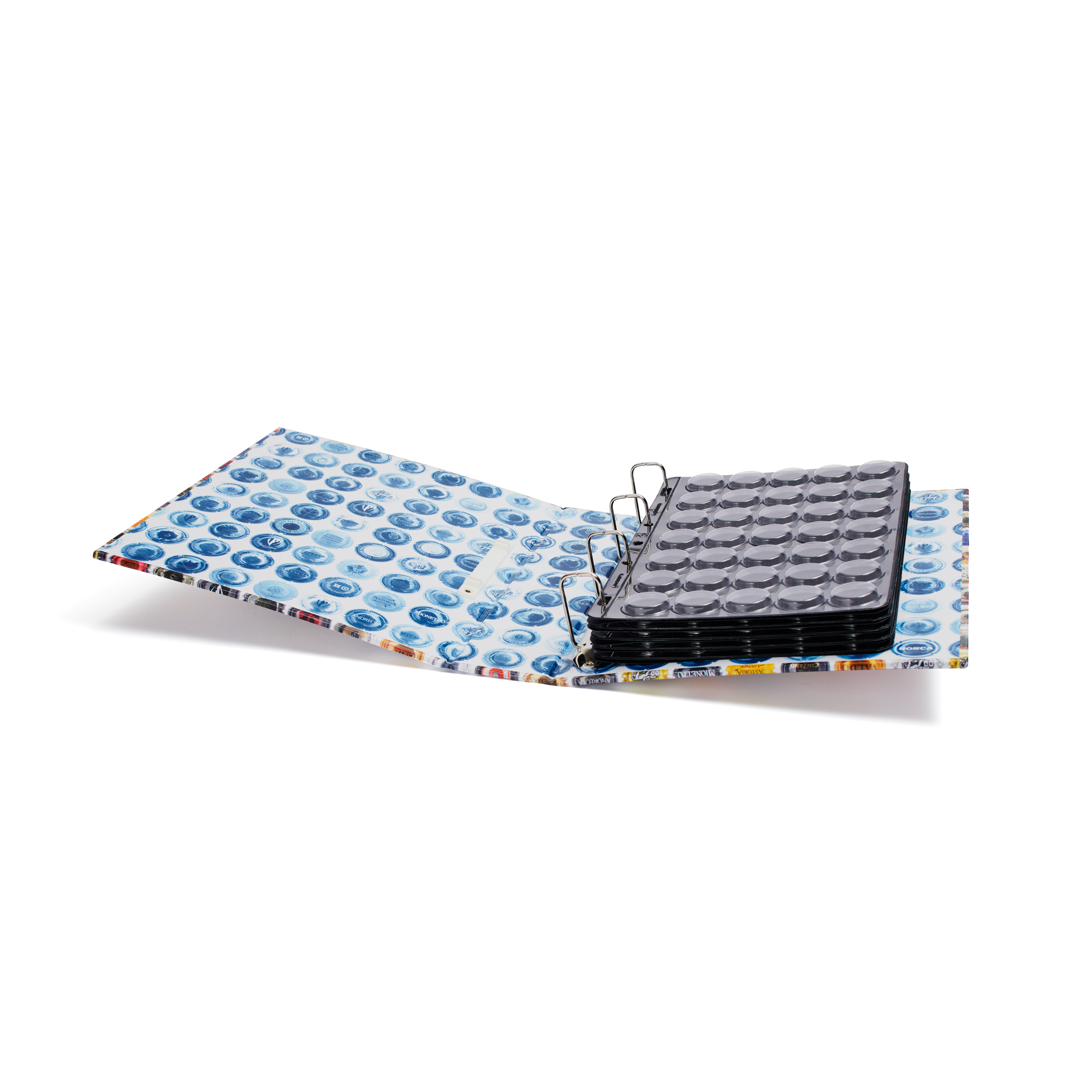 Este álbum para chapas es ideal para tener las colecciones seguras y organizadas. Incluye cinco fundas Compart 42 negras, cada una con espacio para 42 chapas, así como cinco páginas intermedias para separar claramente las fundas. Las chapas se introducen cuidadosamente por detrás en los huecos previstos. El robusto mecanismo de 4 anillas permite un fácil manejo y puede ampliarse hasta nueve fundas (378 chapas) si es necesario. Con unas generosas dimensiones exteriores de 280 x 325 x 77 mm, el álbum ofrece espacio suficiente para organizar de forma óptima su colección.