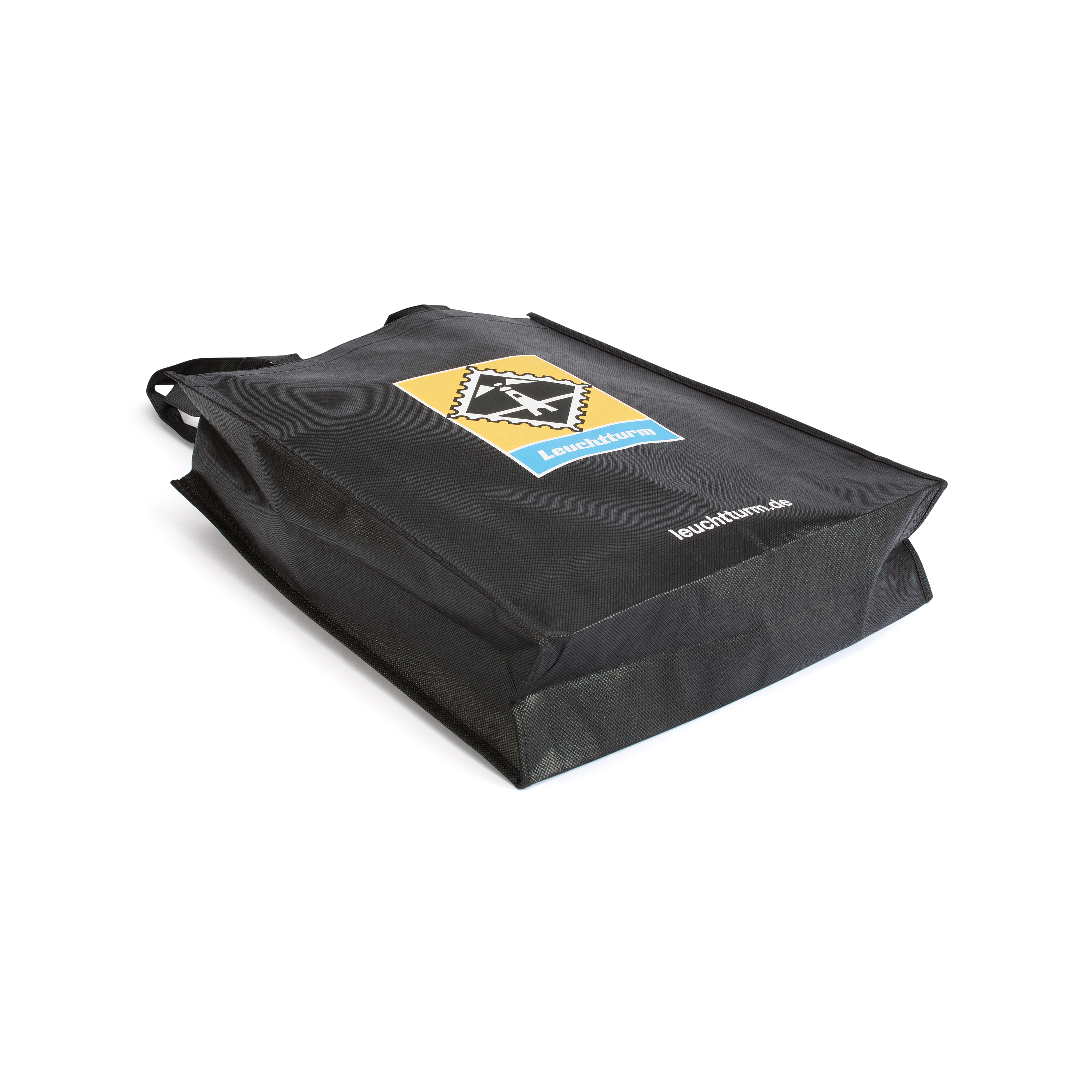 Bolsa estable para reutilizar con asas de gran longitud (35 cm). De material no tejido. Negro con LEUCHTTURM logo colorido. Imprime en ambas caras. Formato: 410 x 345 x 105 mm (Al x An x P).