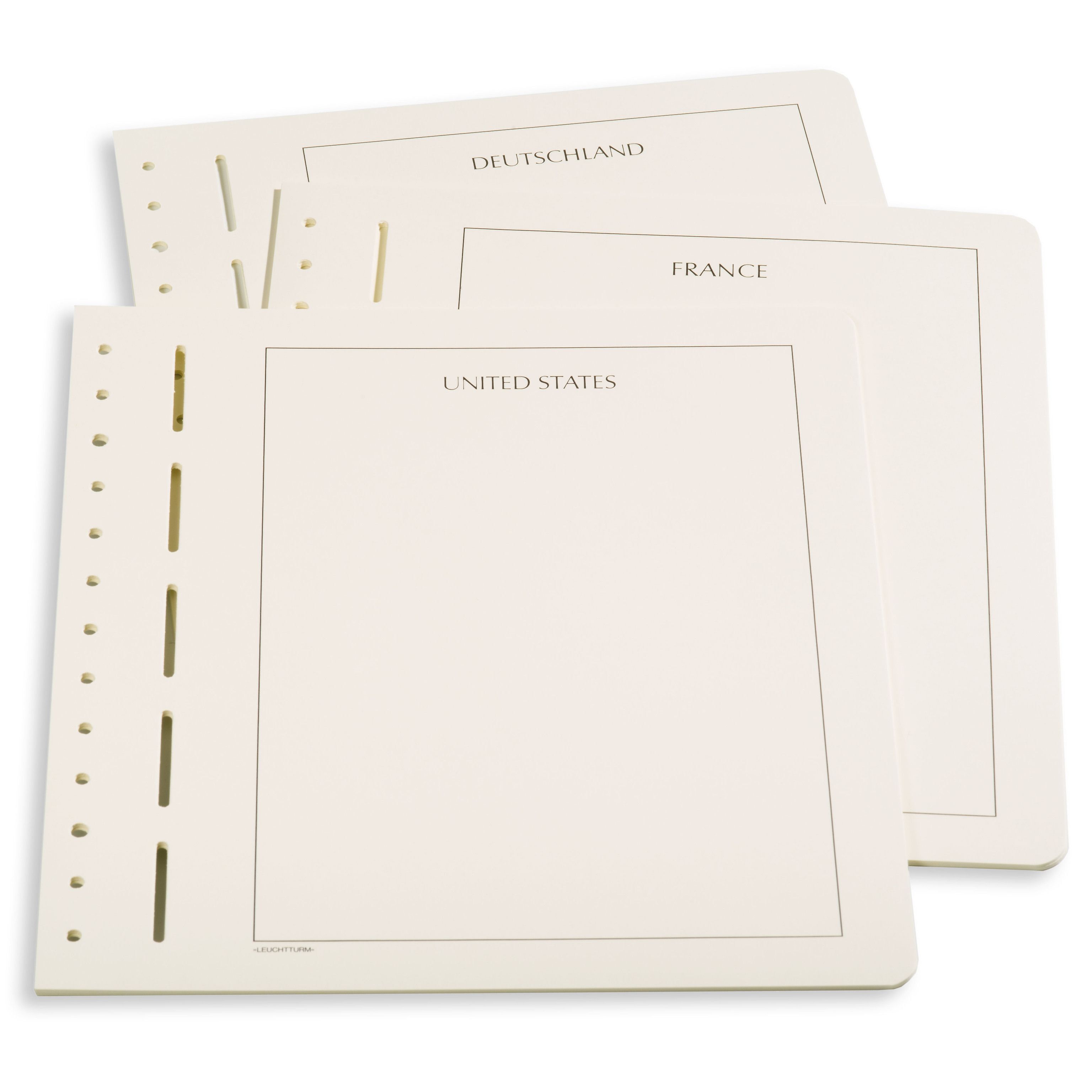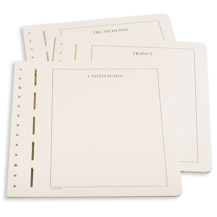 Para completar los álbumes preimpresos y para crear sus propias colecciones existen a su disposición, para los territorios de coleccionismo más usuales, hojas de álbum con el nombre del país. El formato de las hojas es estándar, 270 x 297 mm y es apto para todas las tapas de álbum LEUCHTTURM.