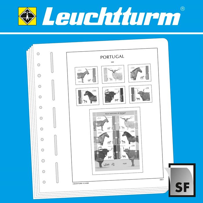 Los álbumes preimpresos LEUCHTTURM (formato 270 x 297 mm, perforación de 13 agujeros) están impresos en cartón de madera sin ácidos (170 g/m2), resistente al envejecimiento y con impresión offset en blanco y negro que reproduce fielmente los detalles. De esta forma, usted puede encontrar rápidamente los sellos que todavía le faltan. Sobre la impresión de los sellos y con el mismo tamaño, están pegados filoestuches-SF fabricados en poliestirol transparente, antireflectante y sin plastificantes. Estos filoestuches sujetan los sellos, a la vez que ofrecen una máxima protección contra el polvo y la humedad.