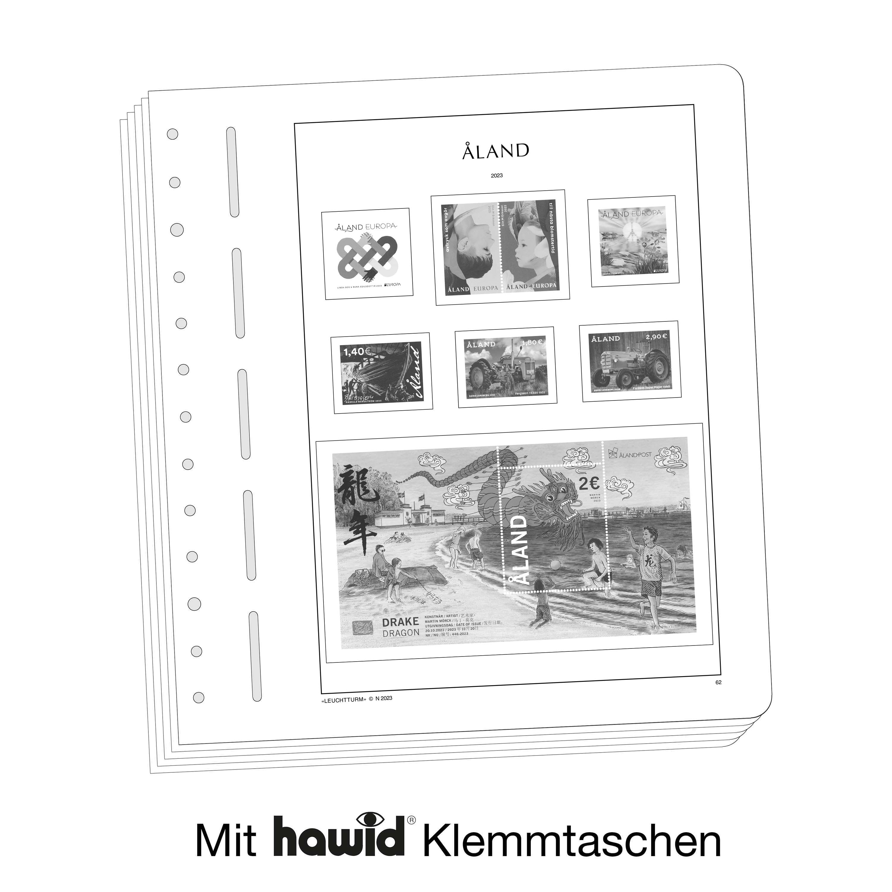 Los álbumes preimpresos LEUCHTTURM (formato 270 x 297 mm, perforación de 13 agujeros) están impresos en cartón de madera sin ácidos (170 g/m2), resistente al envejecimiento y con impresión offset en blanco y negro que reproduce fielmente los detalles. De esta forma, usted puede encontrar rápidamente los sellos que todavía le faltan. Sobre la impresión de los sellos y con el mismo tamaño, están pegados filoestuches-SF fabricados en poliestirol transparente, antireflectante y sin plastificantes. Estos filoestuches sujetan los sellos, a la vez que ofrecen una máxima protección contra el polvo y la humedad.