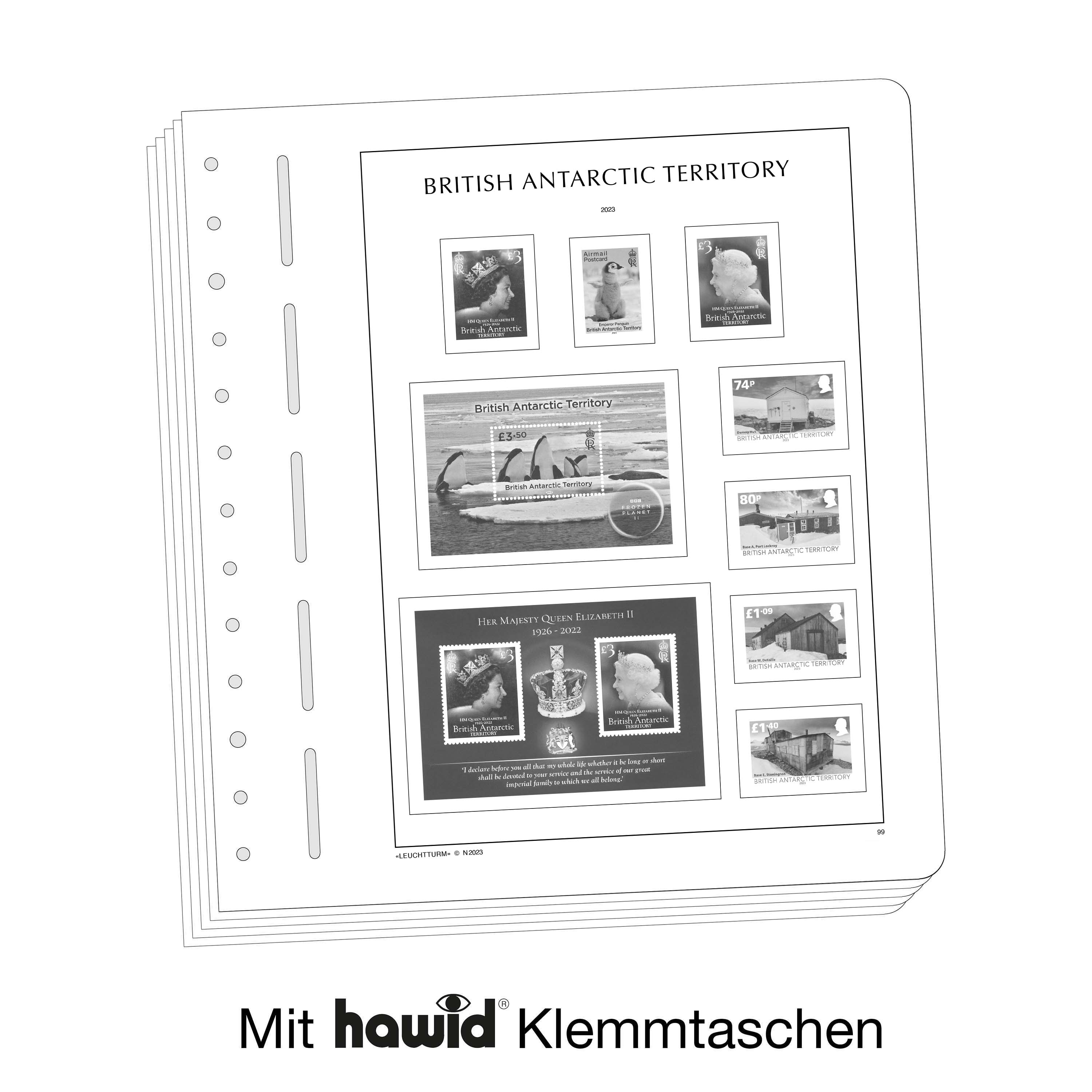 Los álbumes preimpresos LEUCHTTURM (formato 270 x 297 mm, perforación de 13 agujeros) están impresos en cartón de madera sin ácidos(170 g/m2), resistente al envejecimiento y con impresión offset en blanco y negro que reproduce fielmente los detalles. De esta forma, usted puede encontrar rápidamente los sellos que todavía le faltan. Sobre la impresión de los sellos y con el mismo tamaño, están pegados filoestuches-SF fabricados en poliestirol transparente, antireflectante y sin plastificantes. Estos filoestuches sujetan los sellos, a la vez que ofrecen una máxima protección contra el polvo y la humedad.