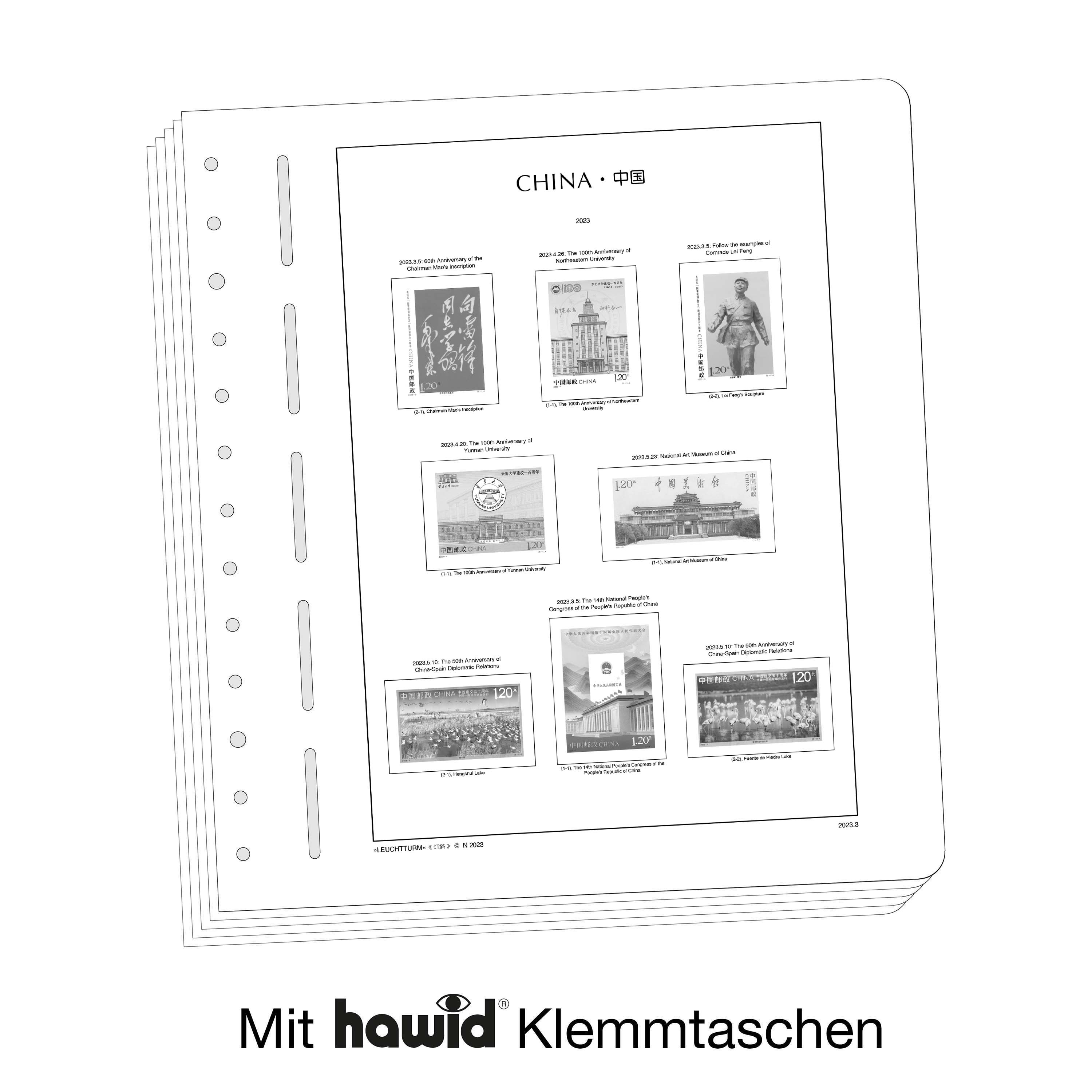 Los álbumes preimpresos LEUCHTTURM (formato 270 x 297 mm, perforación de 13 agujeros) están impresos en cartón de madera sin ácidos(170 g/m2), resistente al envejecimiento y con impresión offset en blanco y negro que reproduce fielmente los detalles. De esta forma, usted puede encontrar rápidamente los sellos que todavía le faltan. Sobre la impresión de los sellos y con el mismo tamaño, están pegados filoestuches-SF fabricados en poliestirol transparente, antireflectante y sin plastificantes. Estos filoestuches sujetan los sellos, a la vez que ofrecen una máxima protección contra el polvo y la humedad.
