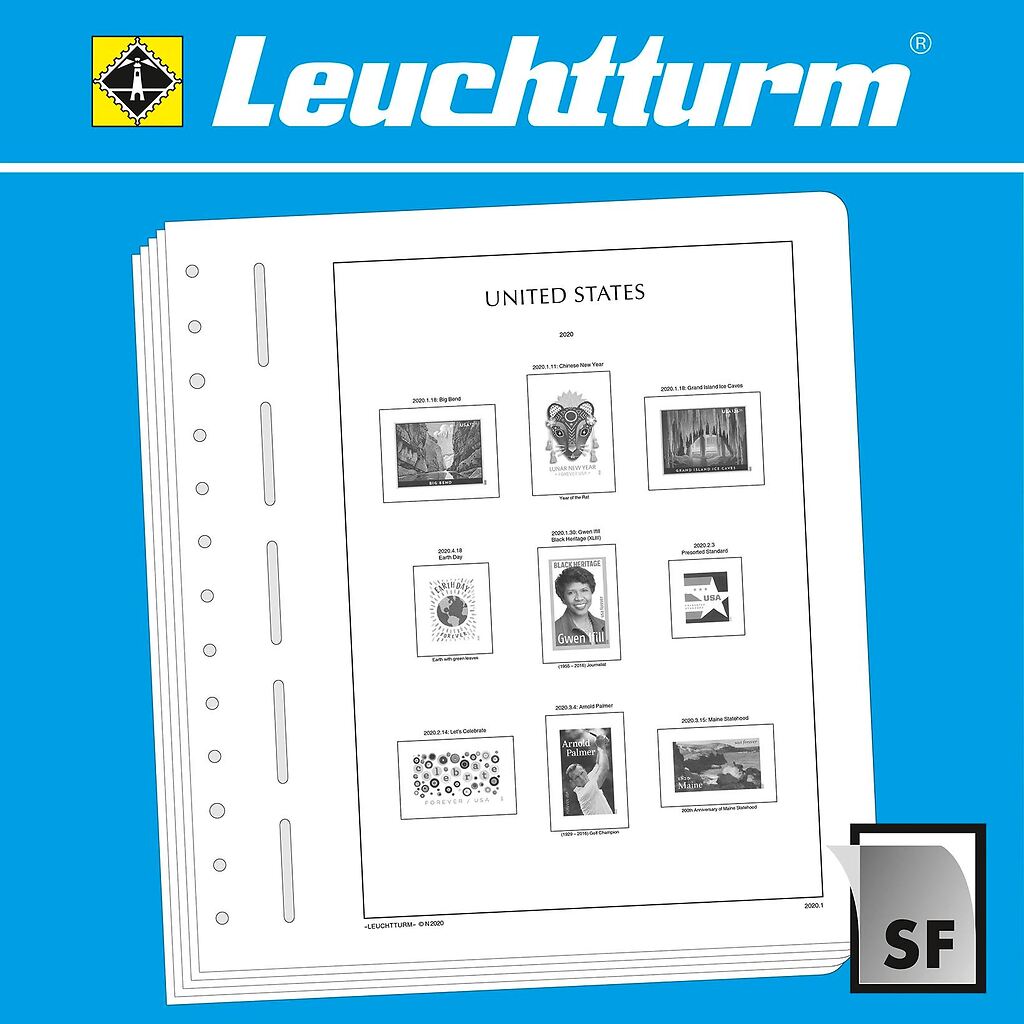 Los álbumes preimpresos LEUCHTTURM (formato 270 x 297 mm, perforación de 13 agujeros) están impresos en cartón de madera sin ácidos(170 g/m2), resistente al envejecimiento y con impresión offset en blanco y negro que reproduce fielmente los detalles. De esta forma, usted puede encontrar rápidamente los sellos que todavía le faltan. Sobre la impresión de los sellos y con el mismo tamaño, están pegados filoestuches-SF fabricados en poliestirol transparente, antireflectante y sin plastificantes. Estos filoestuches sujetan los sellos, a la vez que ofrecen una máxima protección contra el polvo y la humedad.