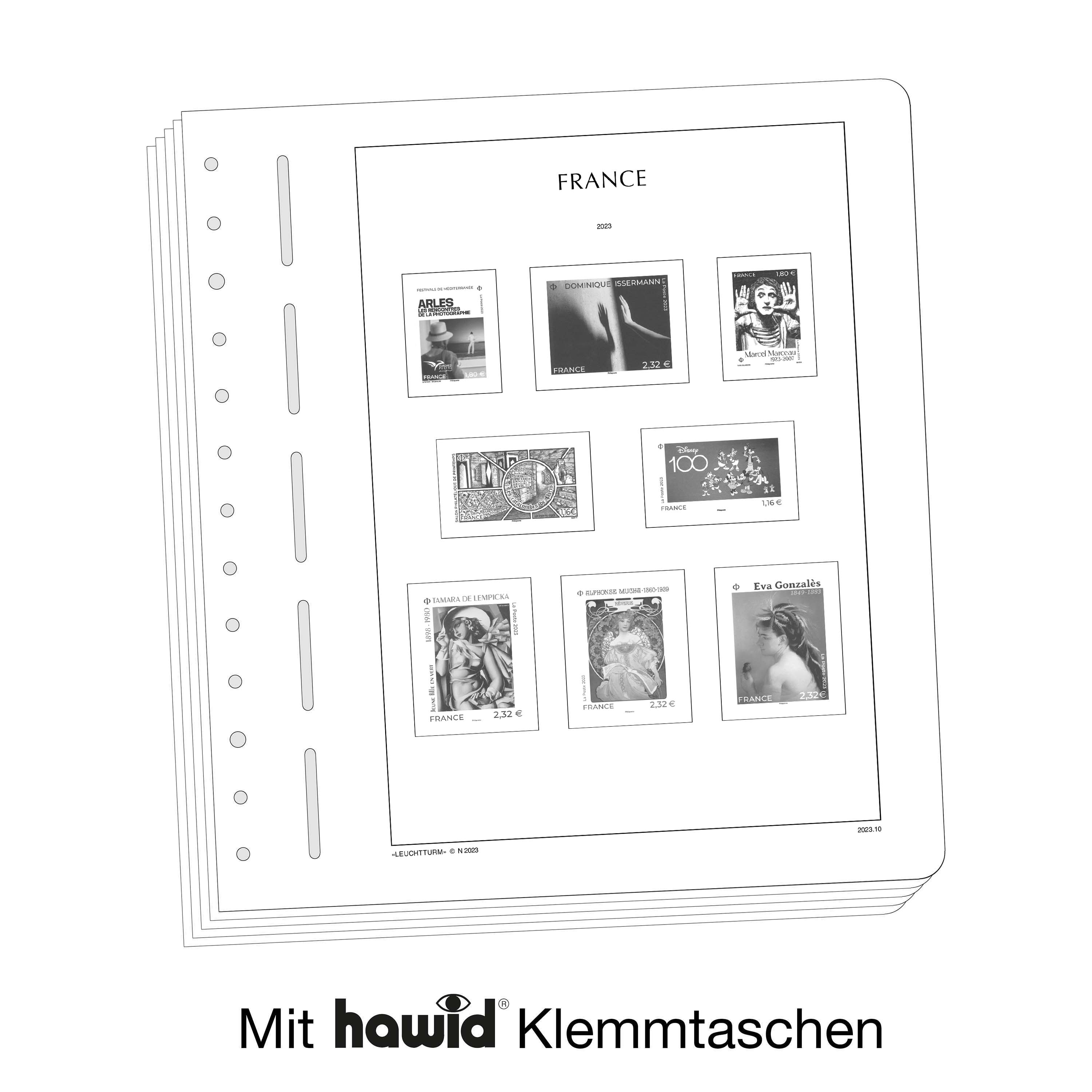 Los álbumes preimpresos LEUCHTTURM (formato 270 x 297 mm, perforación de 13 agujeros) están impresos en cartón de madera sin ácidos(170 g/m2), resistente al envejecimiento y con impresión offset en blanco y negro que reproduce fielmente los detalles. De esta forma, usted puede encontrar rápidamente los sellos que todavía le faltan. Sobre la impresión de los sellos y con el mismo tamaño, están pegados filoestuches-SF fabricados en poliestirol transparente, antireflectante y sin plastificantes. Estos filoestuches sujetan los sellos, a la vez que ofrecen una máxima protección contra el polvo y la humedad.